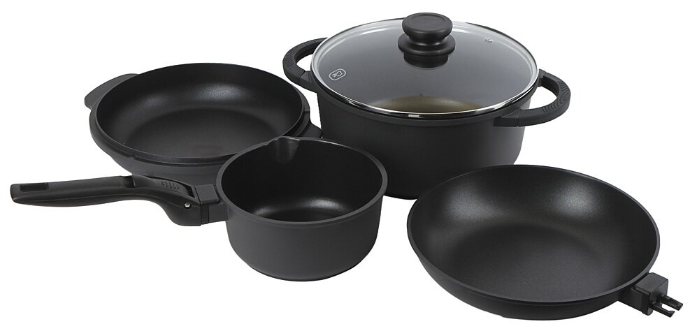 Комплектация кастрюля 5 л; сковорода 24 см; сотейник 24 см; ковш 16 см; крышка; съемная ручка