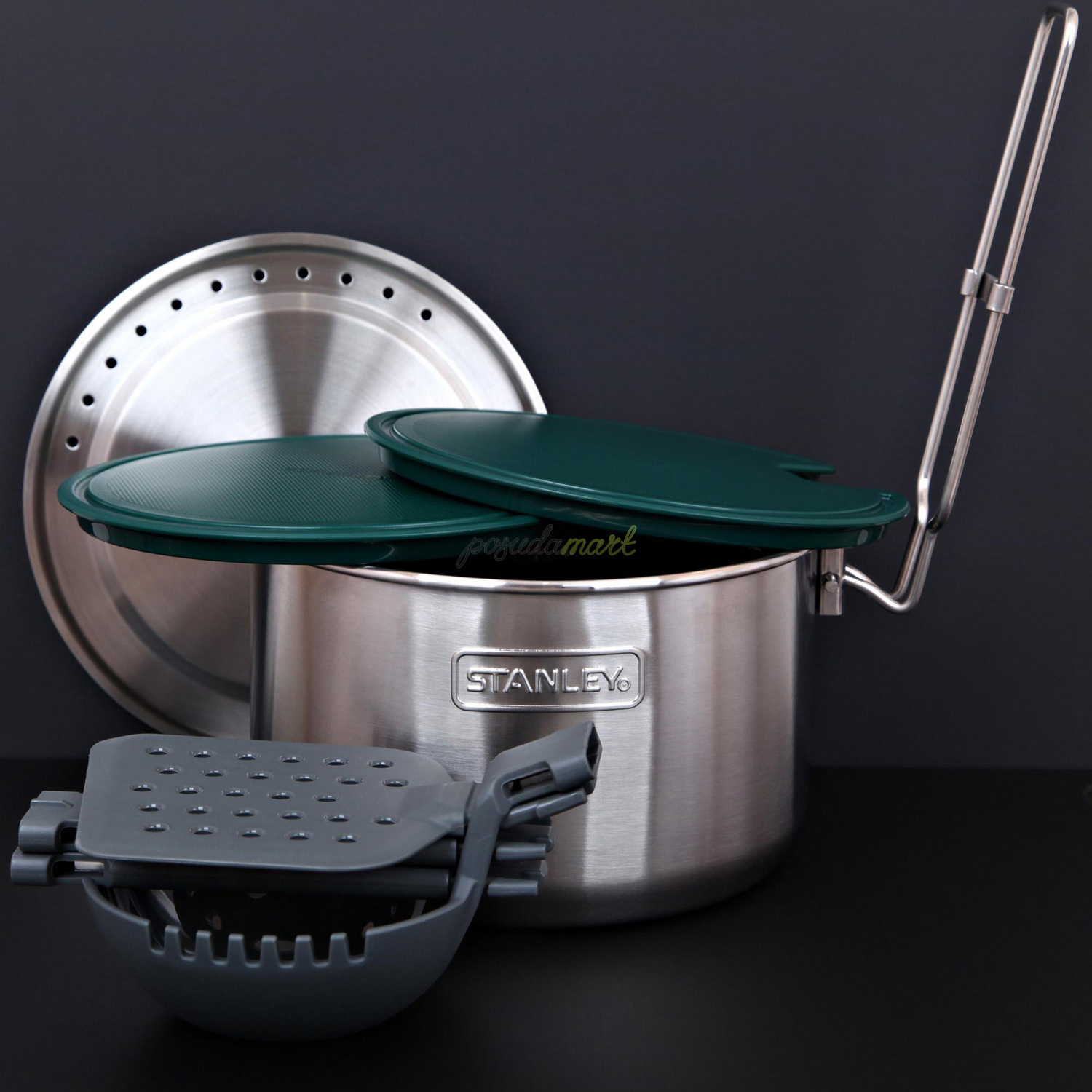 Состав комплекта 1,5L кастрюля + крышка с отверстием для пара. 0,5L чаша+крышка/разделочная доска в количестве 2 штук. Жаростойкая шумовка из полиамида с удлиняющейся ручкой и половник из полиамида с удлиняющейся ручкой.