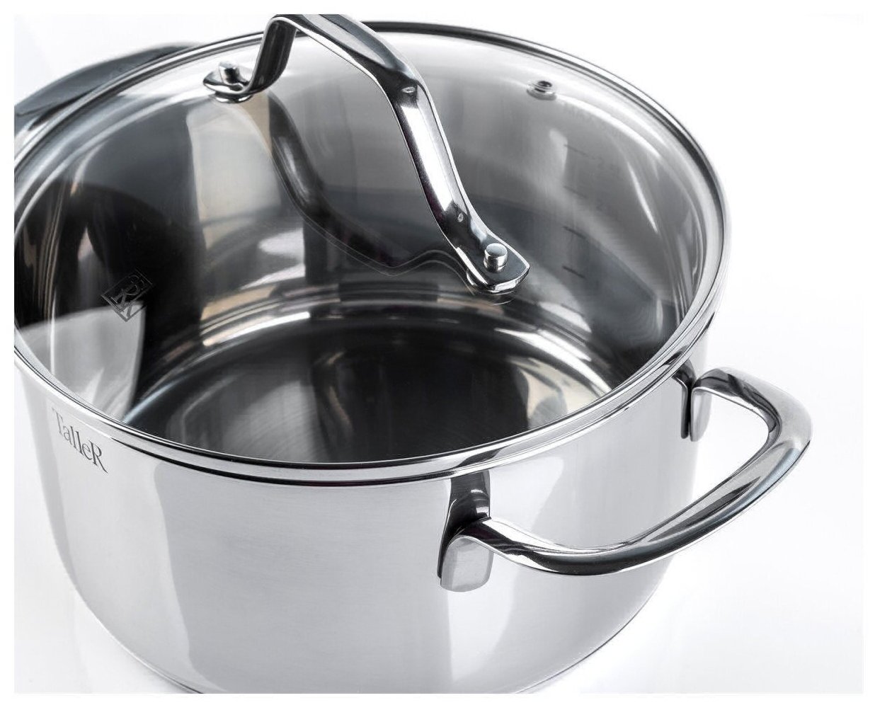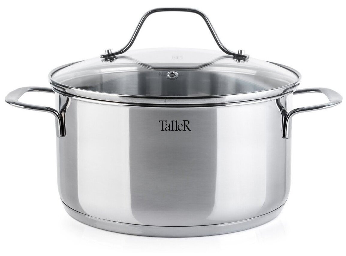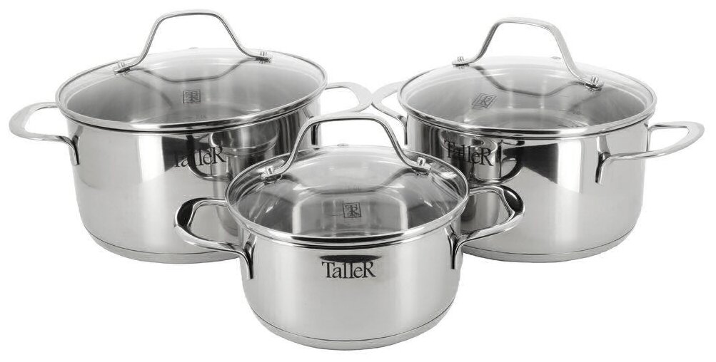 кастрюля 1.5 л - 16*8 см; кастрюля 3 л - 20*10.5 см; кастрюля 4 л - 22*11.5 см; отметки литража; зеркальная полировка; крышки из жаропрочного стекла с отверстием для выхода пара; индукционное дно
