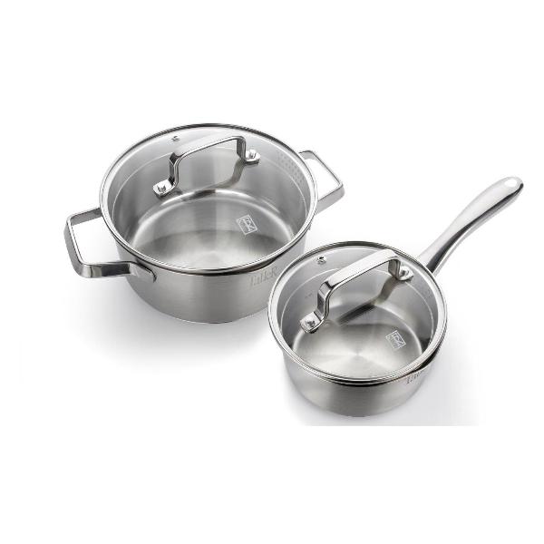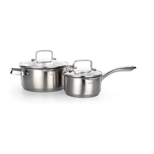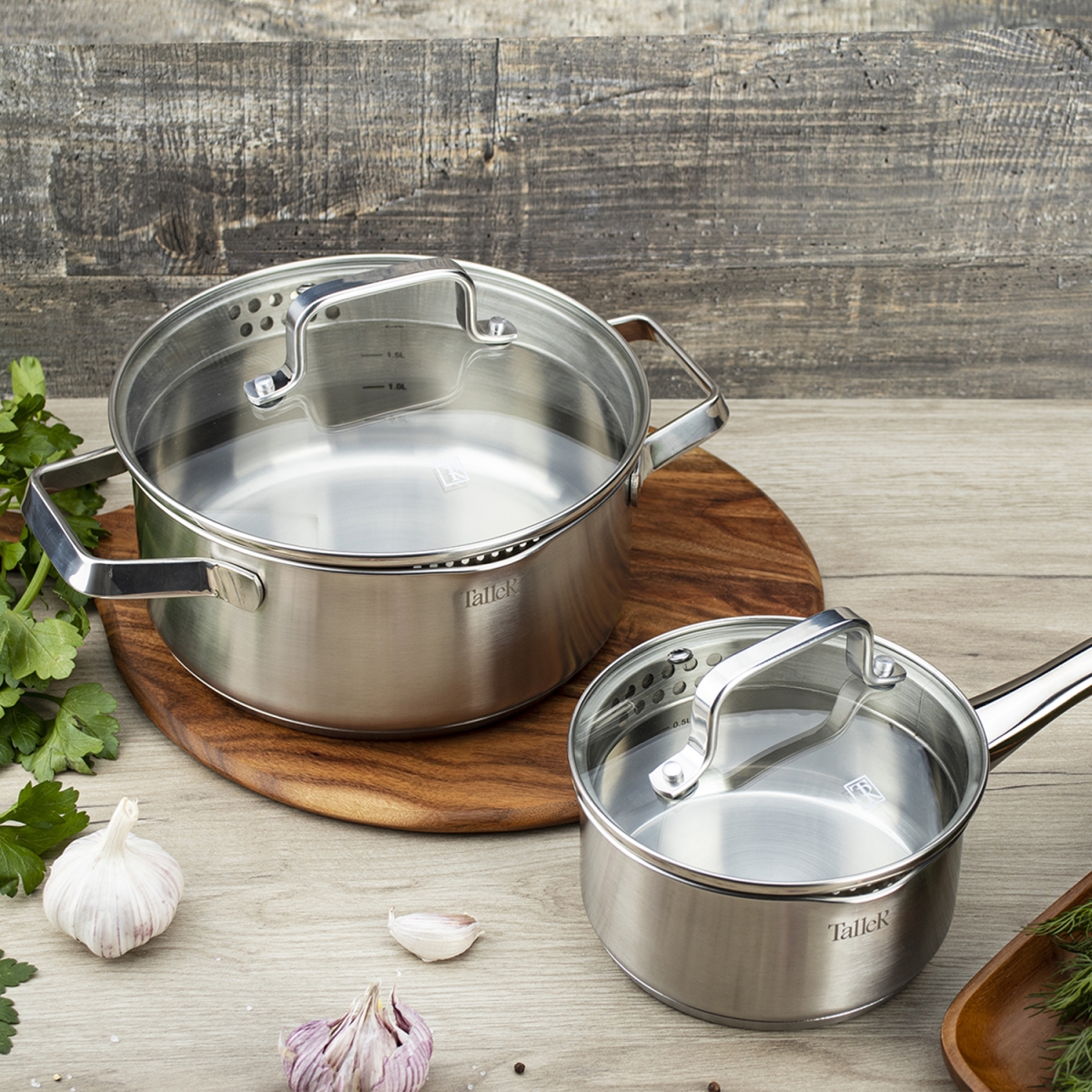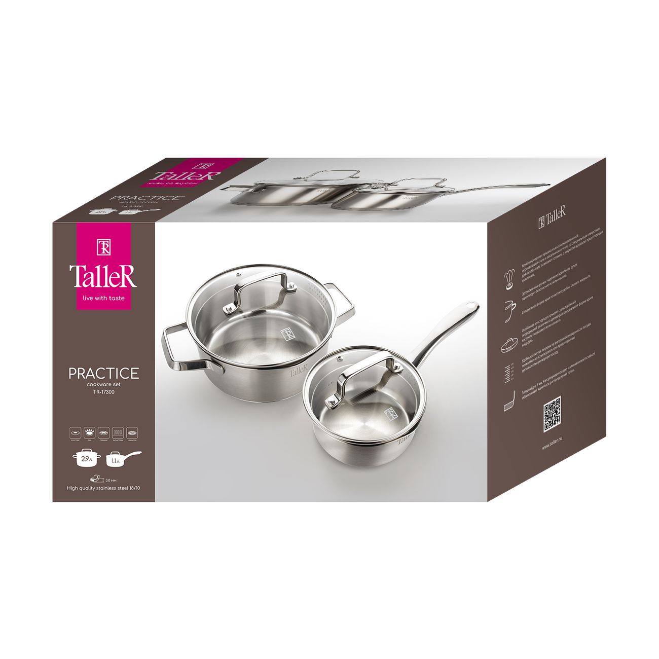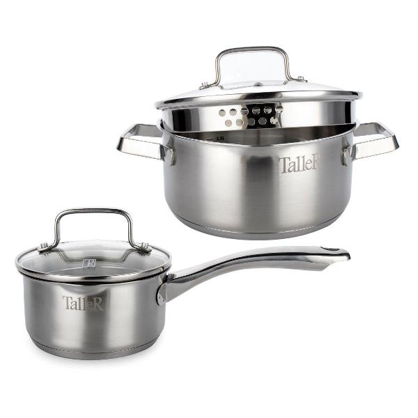 Набор посуды TalleR «Практик» TR-17300 — это ковш 1,1 л, кастрюля 2,9 л и две стеклянные крышки для них, дополненные клапанами паровыпуска. Материал, из которого изготовлен корпус — нержавеющая сталь. Предусмотрены металлические ручки. Все изделия, которые входят в комплект, можно ставить на газовые, чугунные, стеклокерамические плиты и на конфорки, работающие по индукционной технологии. Допускается мытье в посудомоечной машине.