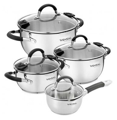 ковш 1,3 л, кастрюли 1,8 л, 2,5 л и 4,5 л, 4 крышки