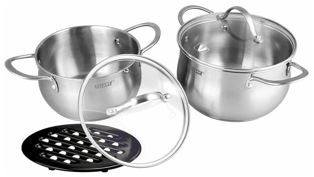 кастрюли: 3.4 л, 2.4 л; 2 крышки 20 см, 18 см; бакелитовая подставка