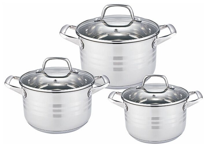 материал крышек: сталь, стекло; материал ручек: сталь; многослойное дно; кастрюли 16х10.5 см, 18х11.5 см, 20х12.5 см