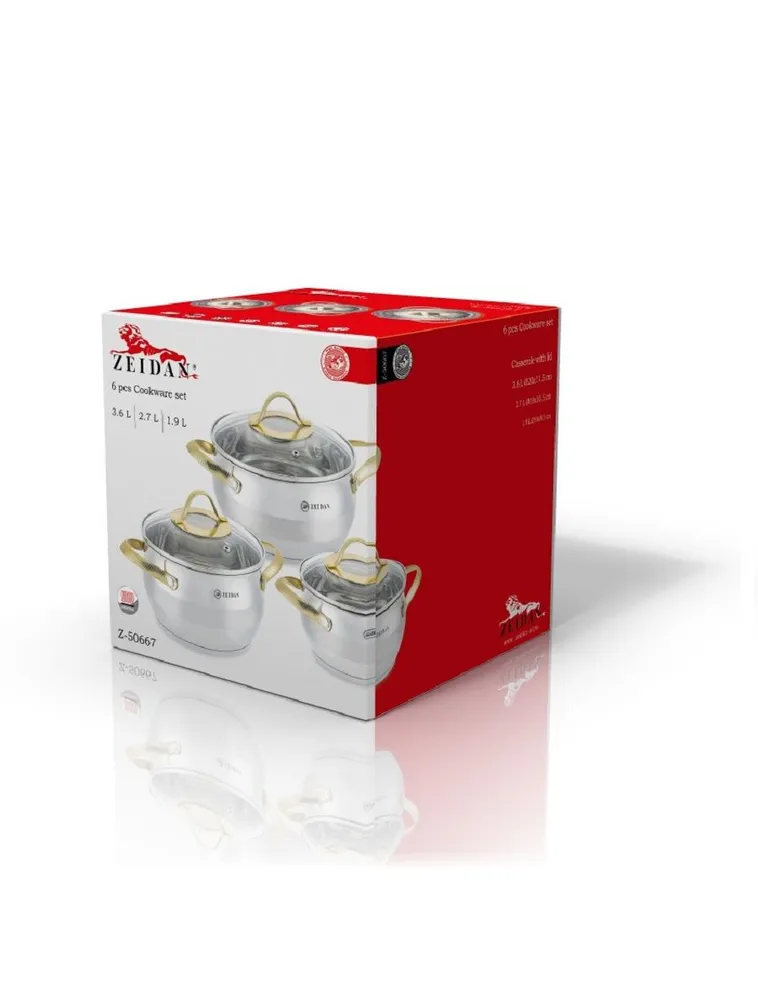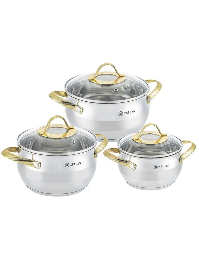 Набор посуды ZEIDAN Z-50667 — это элегантный и функциональный комплект, состоящий из 6 предметов, который станет прекрасным дополнением к любой кухне. В набор входят три кастрюли с крышками, объемами 1.9 литра (диаметр 16 см), 2.7 литра (диаметр 18 см) и 3.6 литра (диаметр 20 см), что позволяет готовить разнообразные блюда для всей семьи.