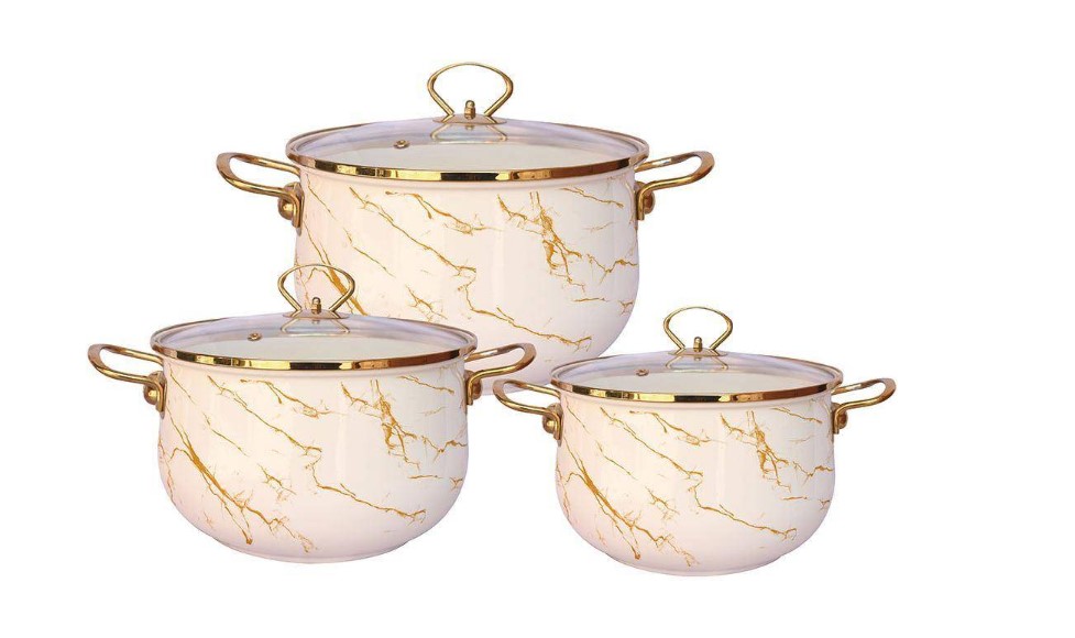 3 КАСТРЮЛИ С КРЫШКАМИ: 2,4 Л (d18 см), 4,4 Л (d22 см), 7,0 Л (d26 см) с внутренним и внешним трехслойным эмалированным покрытием, материал - углеродистая сталь.