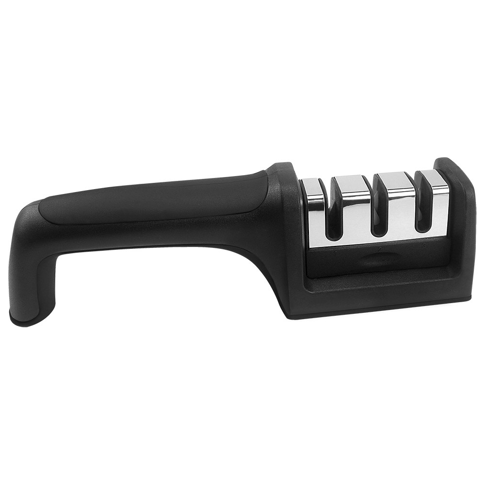 3 уровня заточки. Корпус из высококачественного пластика. Затачивающие элементы из вольфрамового сплава и керамики. Резиновое покрытие нижней части предотвращает от скольжения.