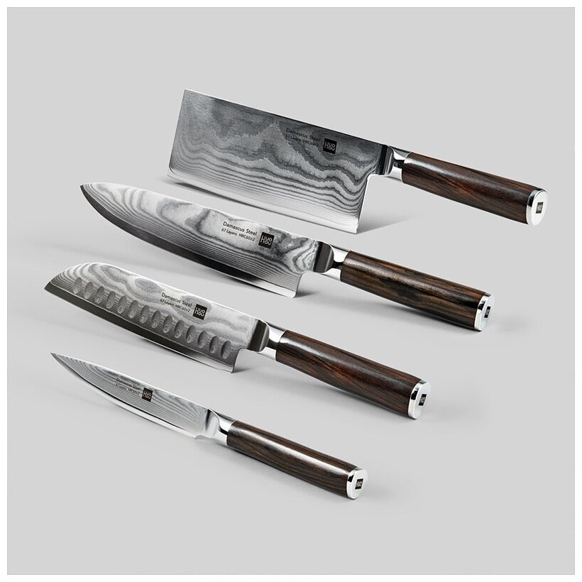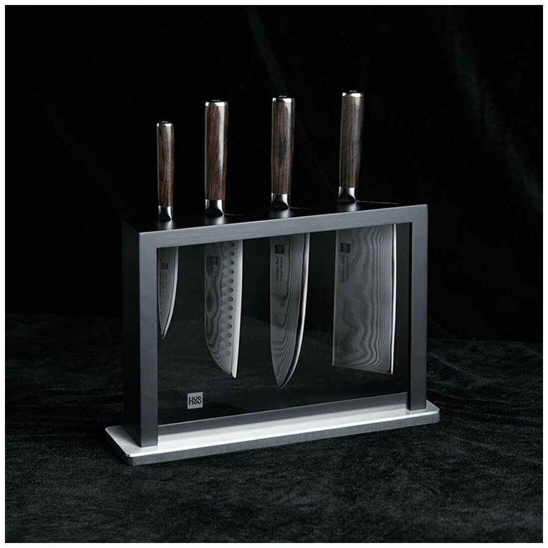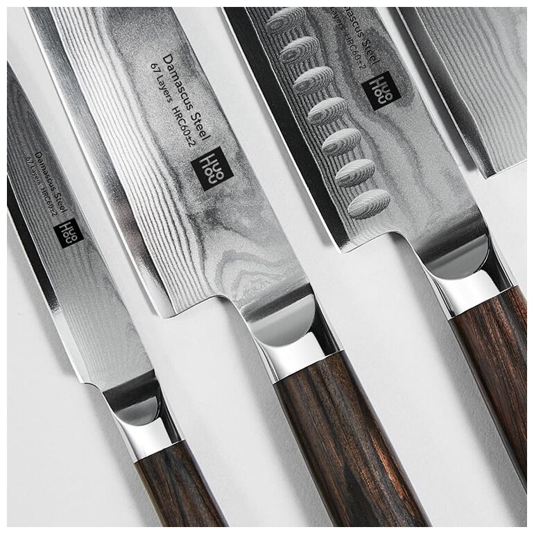 С помощью ножей Huo Hou можно овладеть рецептами как западной, так и восточной кухни, а также реализовать самые смелые кулинарные задумки. Многослойное лезвие состоит их 67 слоев стали. Каждый нож имеет чрезвычайно острую режущую кромку и сохраняет идеальное состояние, очень долго не теряющую режущие свойства. Твердость клинка при этом составляет 60±2 HRC. Ручки ножей изготовлены из отполированного эбенового дерева. Эбеновое (черное) дерево полируется настолько хорошо, что в результате данного процесса материал приобретает зеркальную поверхность. Подставка Huo Hou выполнена из каучукового дерева и имеет устойчивое основание. Благодаря продуманному дизайну данный аксессуар отлично впишется в любой интерьер и Ваши шикарные ножи будут всегда под рукой!