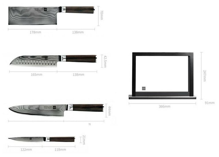 Комплектация: разделочный нож (316х70 мм) нож шеф-повара (330х44 мм), нож сантоку (303х42,5 мм) многофункциональный нож(240х21 мм). Материал подставки из импортного каучукового дерева (366х247х91 мм)