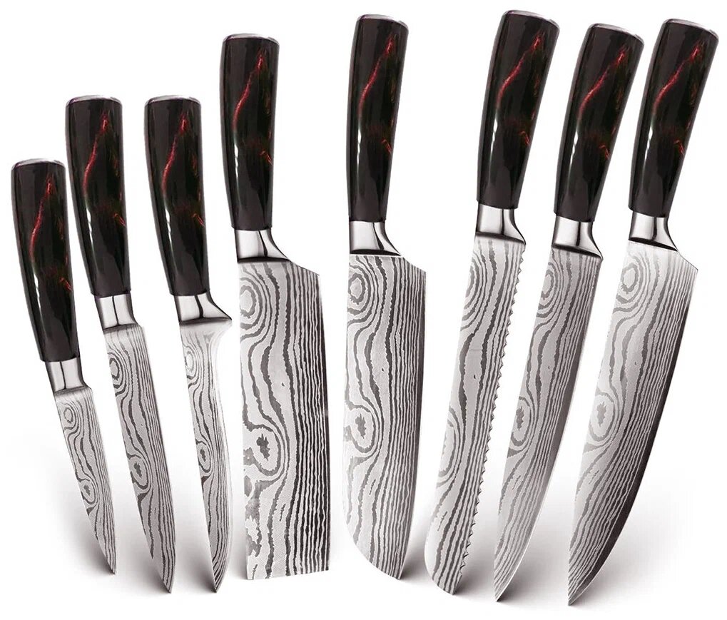 В комплекте ножи: разделочный, для хлеба, шеф-нож, сантоку, накири, обвалочный, универсальный, для овощей.