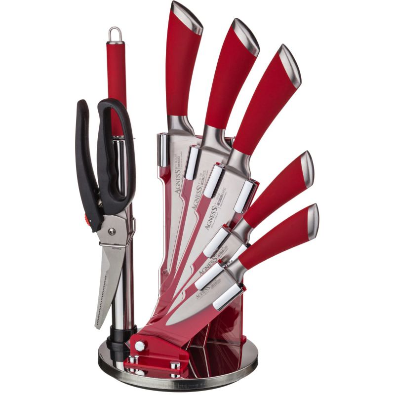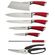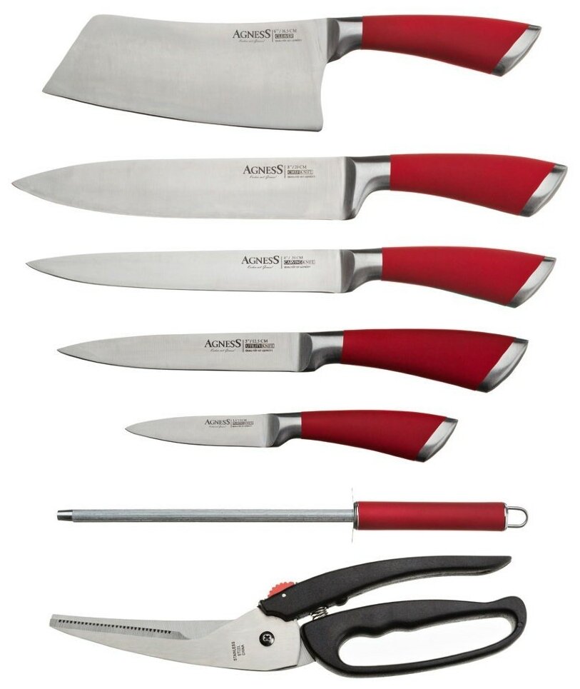 нож для овощей 9 см, нож универсальный 12,5 см, нож-топорик 16,5 см, нож для нарезки 20 см, нож поварской 20 см, ножницы, мусат, подставка
