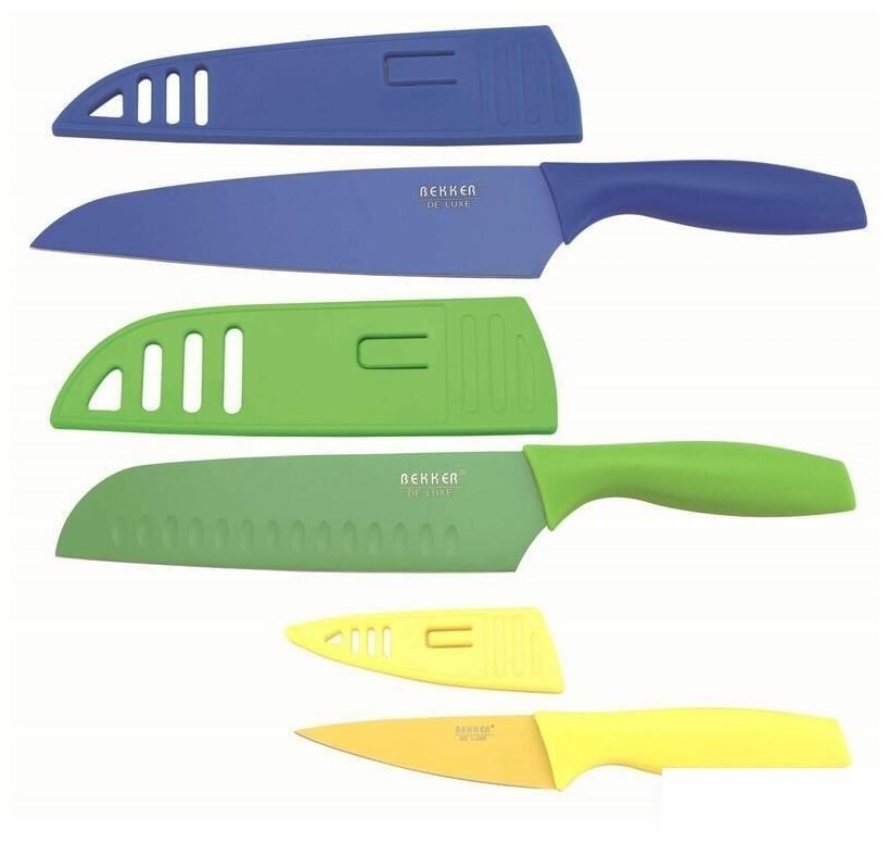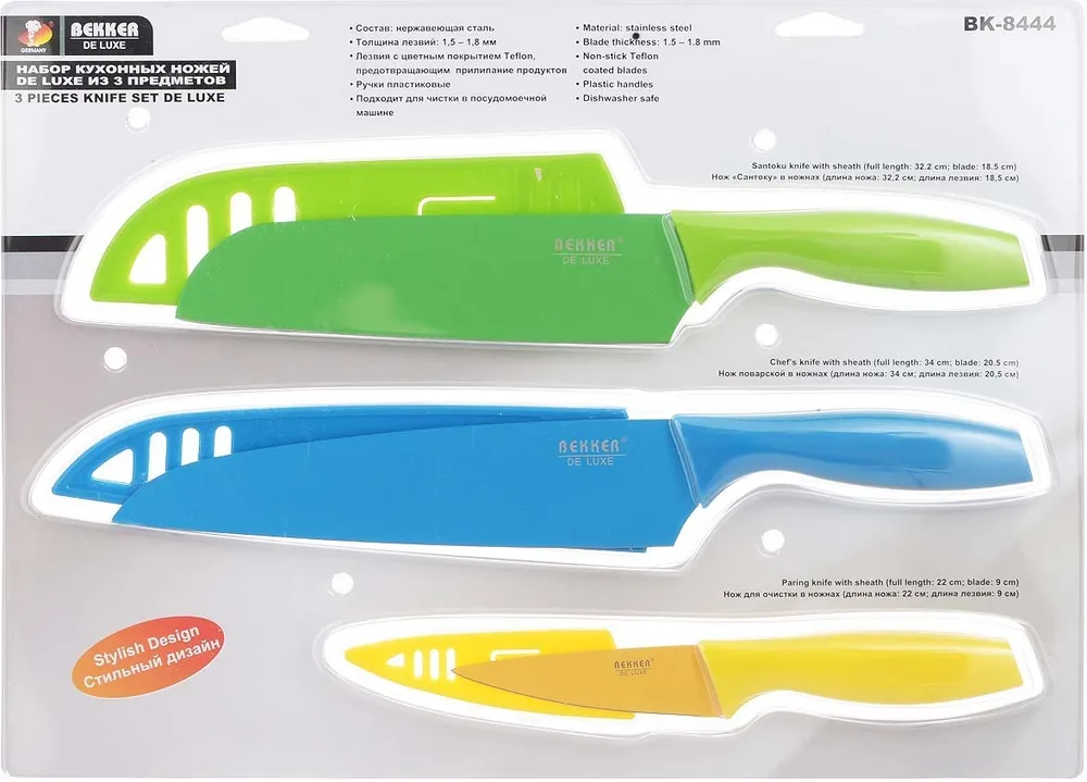 Лезвия с цветным покрытием Teflon, предотвращающим прилипание продуктов. Набор ножей состоит из 3 предметов (ножи в ножнах):