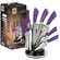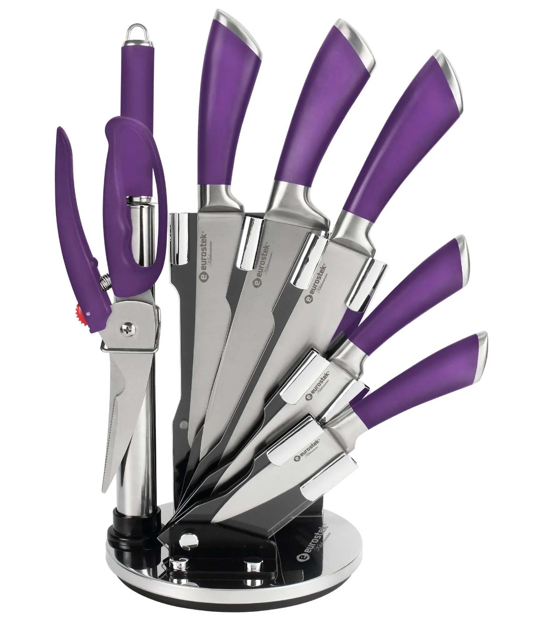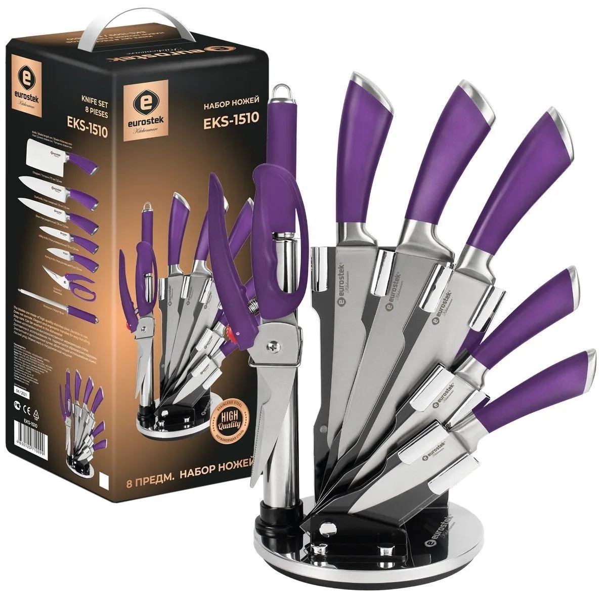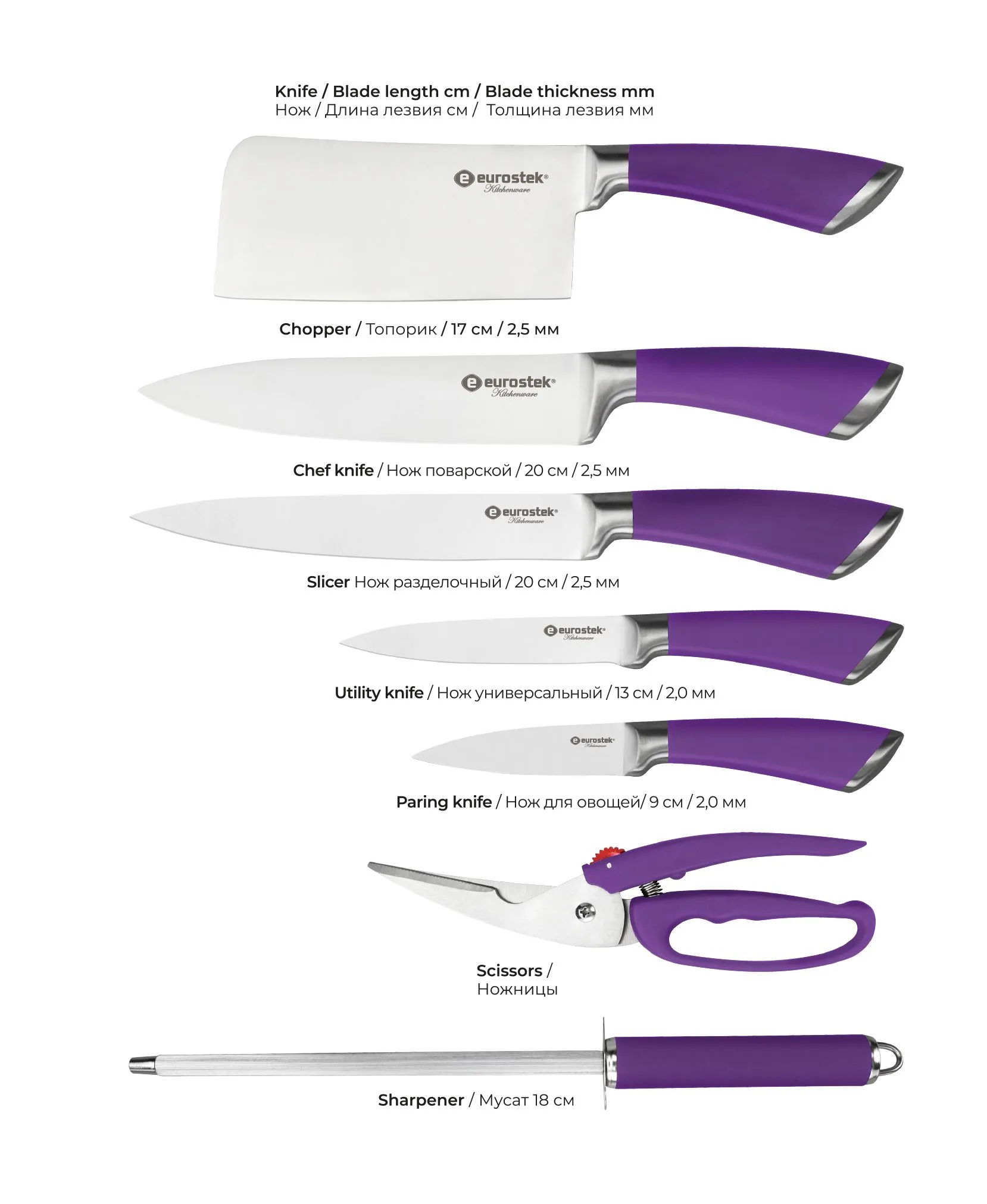 Типы ножей: Топорик 17см, пов-ой 20см, разд-ый 20см, универ-ый 13см, овощной 9см, Мусат,нож-цы,подставка