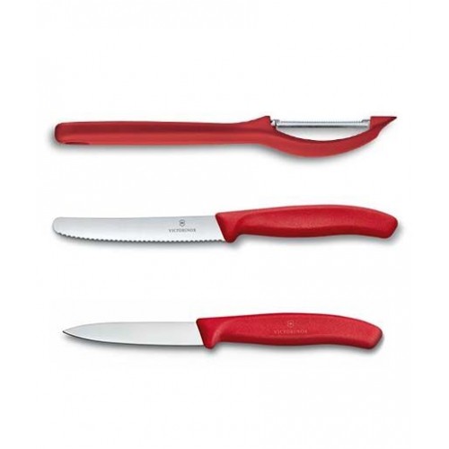 Особенности: Универсальная овощечистка с серейторной заточкой 7.6075.1; Нож для овощей с заострённым кончиком 8 см 6.7601; Нож для томатов с серейторной заточкой 11 см 6.7831.