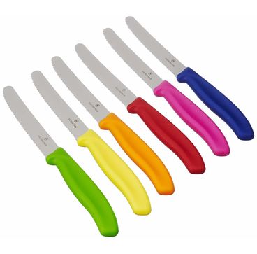 Комплектация 6 разноцветных ножей с пластиковой рукоятью и волнистым лезвием 11 см