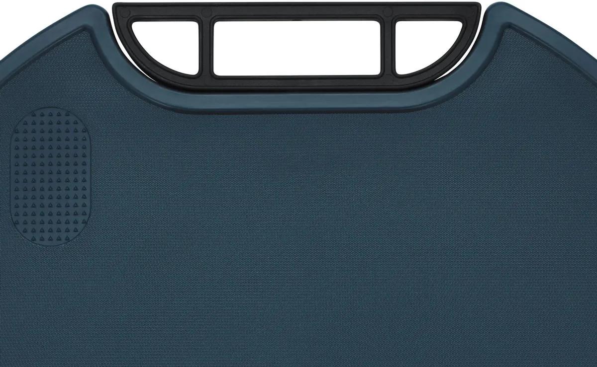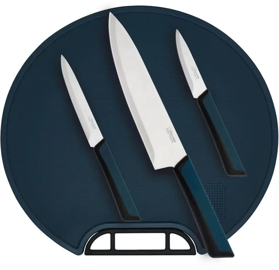 Материал клинка: высококачественная нержавеющая сталь X30Cr13. Особенности: двусторонняя заточка лезвий. Материал рукотяки: ударопрочный полипропилен с прорезиненными вставками, препятствующими скольжению. Разделочная доска из полипропилена оснащена вращающейся ручкой для удобства использования.