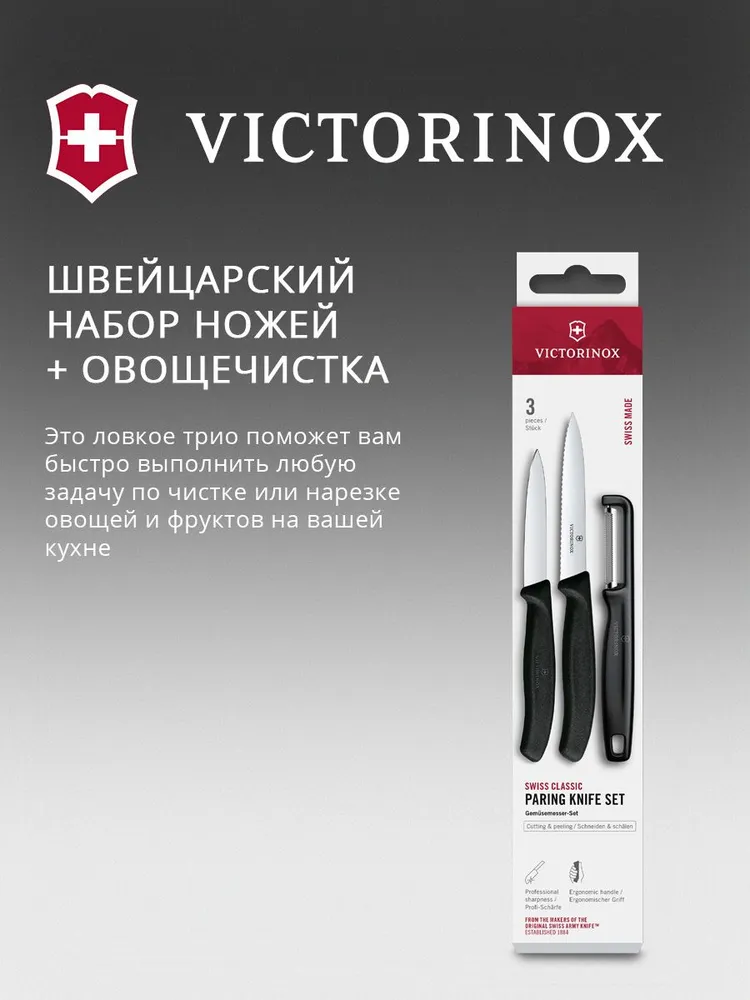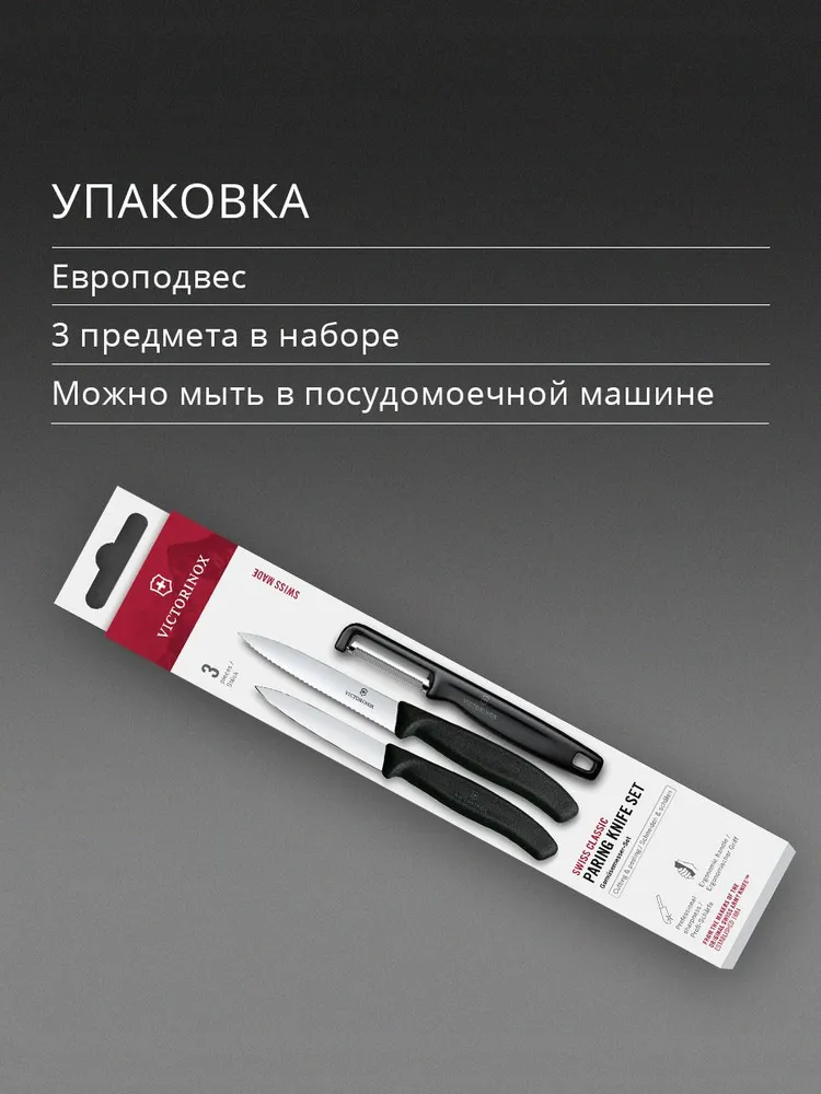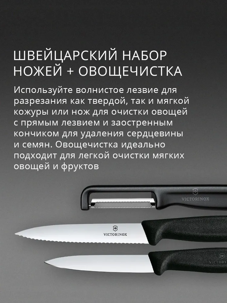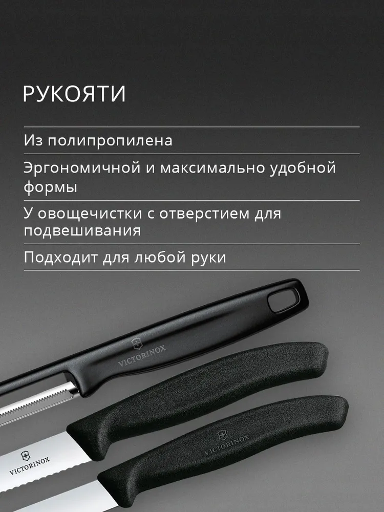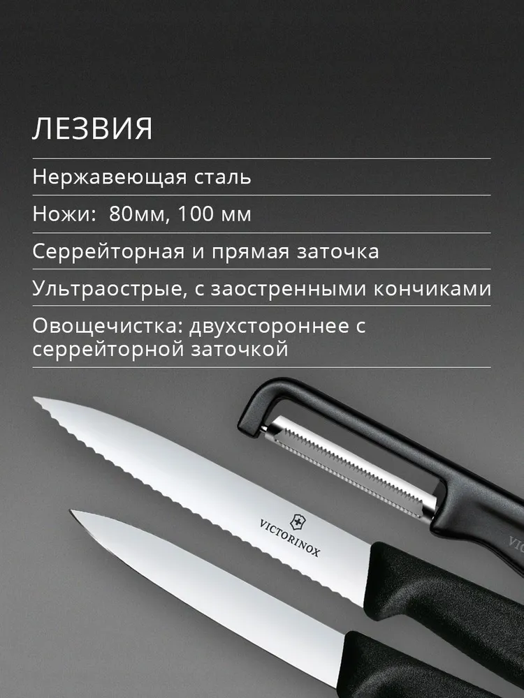 Состав комплекта В комплекте 2 ножа с прямой и серрейт заточкой, длиной лезвия 8 и 10 см, овощечистка Iota c двойным лезвием и серрейт заточкой