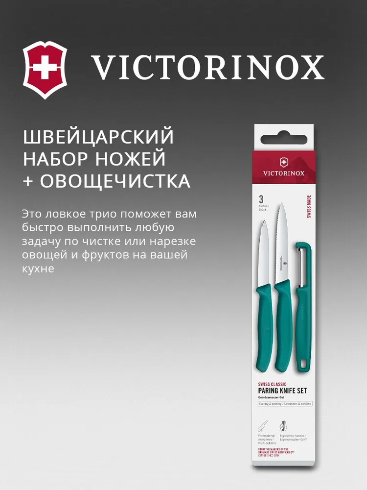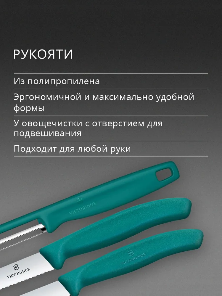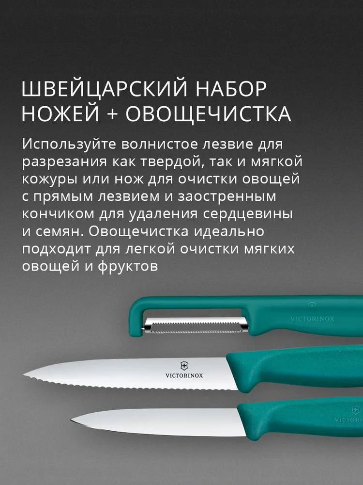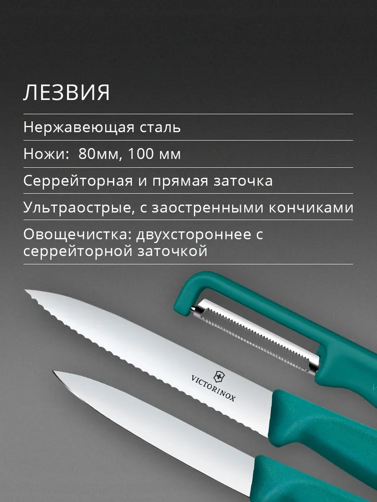 Состав комплекта В комплекте зеленых 2 ножа с прямой и серрейт заточкой, длиной лезвия 8 и 10 см, овощечистка Iota c двойным лезвием и серрейт заточкой