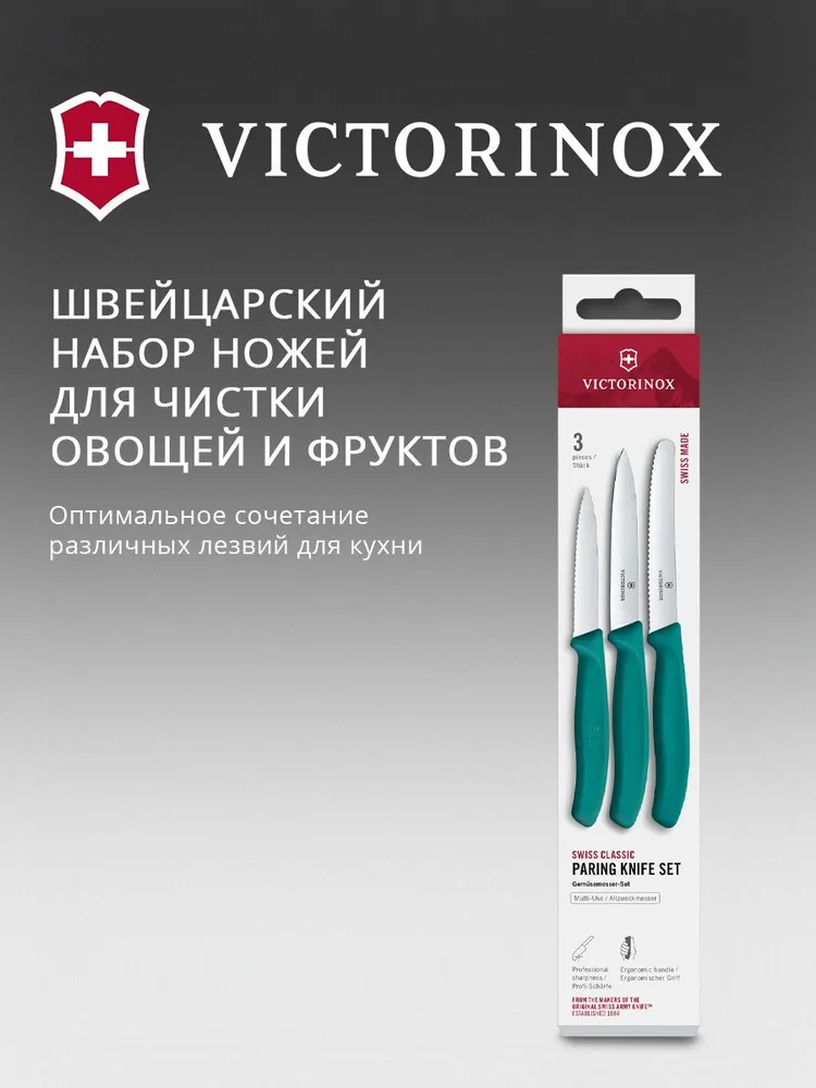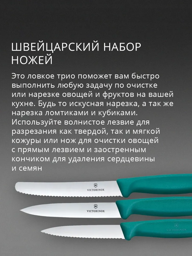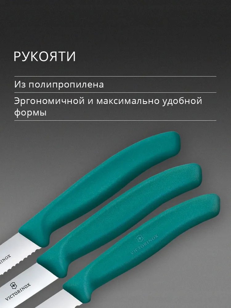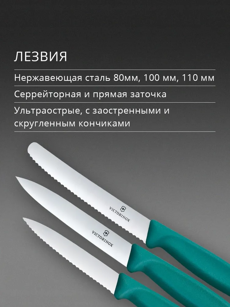 Состав комплекта В комплекте 3 зеленых ножа: нож с сререйт заточкой, заостренным кончиком и длиной лезвия 8см, нож с прямой заточкой, заостренным кончиком и длиной лезвия 10см, нож с серрейт заточкой, закругленным кончиком и длиной лезвия 11 см