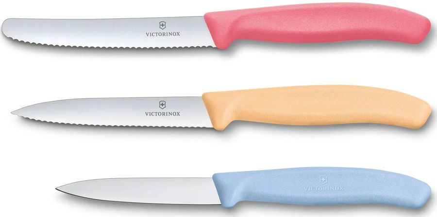 Нож для чистки и резки томатов Victorinox Swiss Classic Trend Colors, лезвие: 110 мм., светло-красный. Нож для чистки и резки овощей Victorinox Swiss Classic Trend Colors, лезвие: 100 мм., светло-оранжевый. Нож для чистки и резки овощей Victorinox Swiss Classic Trend Colors, длина лезвия: 80 мм.