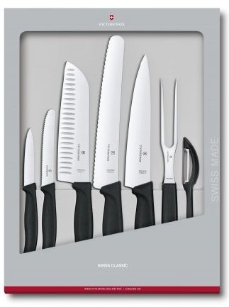 Состав комплекта: нож для овощей с острым кончиком 8см; нож для нарезки помидоров и сосисок, серрейтор 11см; нож Santoku с воздушными карманами; нож для хлеба, тортов и пирожных, серрейтор; разделочный нож с широким лезвием; вилка разделочная, 15см; универсальная овощечистка