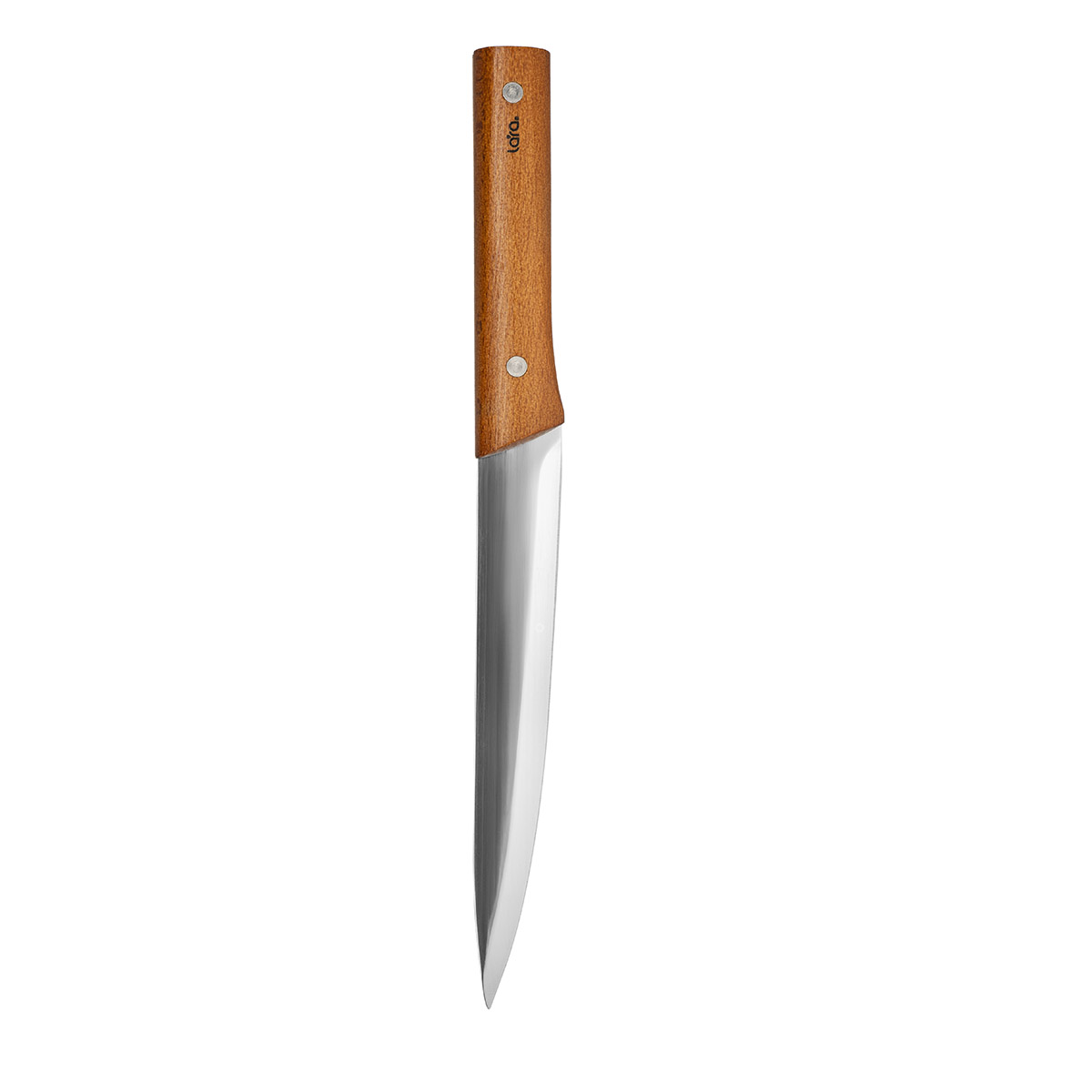 Удобная рукоять из темной древесины придает дизайну ножа завершенный вид.