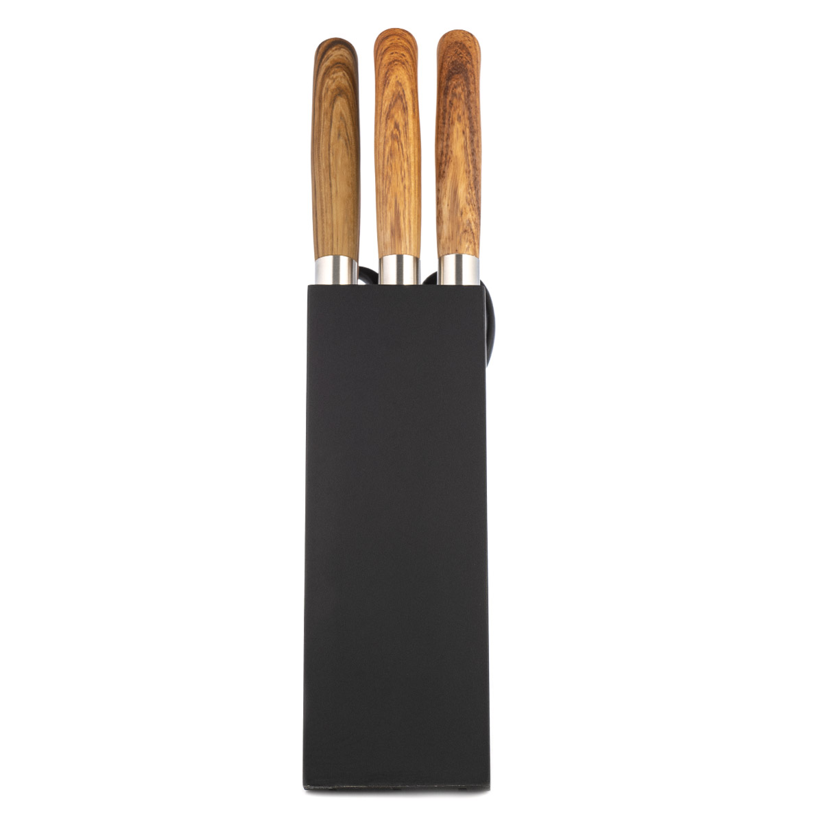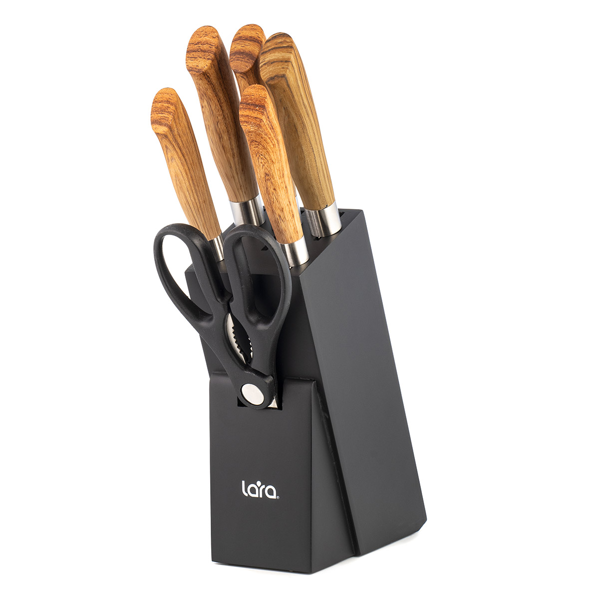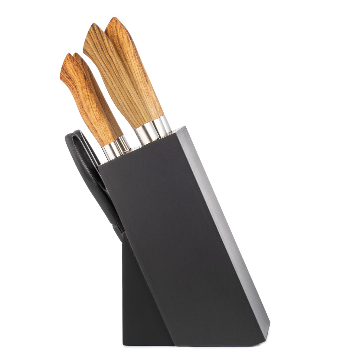 В комплект входят компактная и устойчивая подставка для хранения, ножницы с орехоколом и пять видов ножей: для чистки, универсальный, для овощей, разделочный, поварской. Рекомендуется ручная мойка.