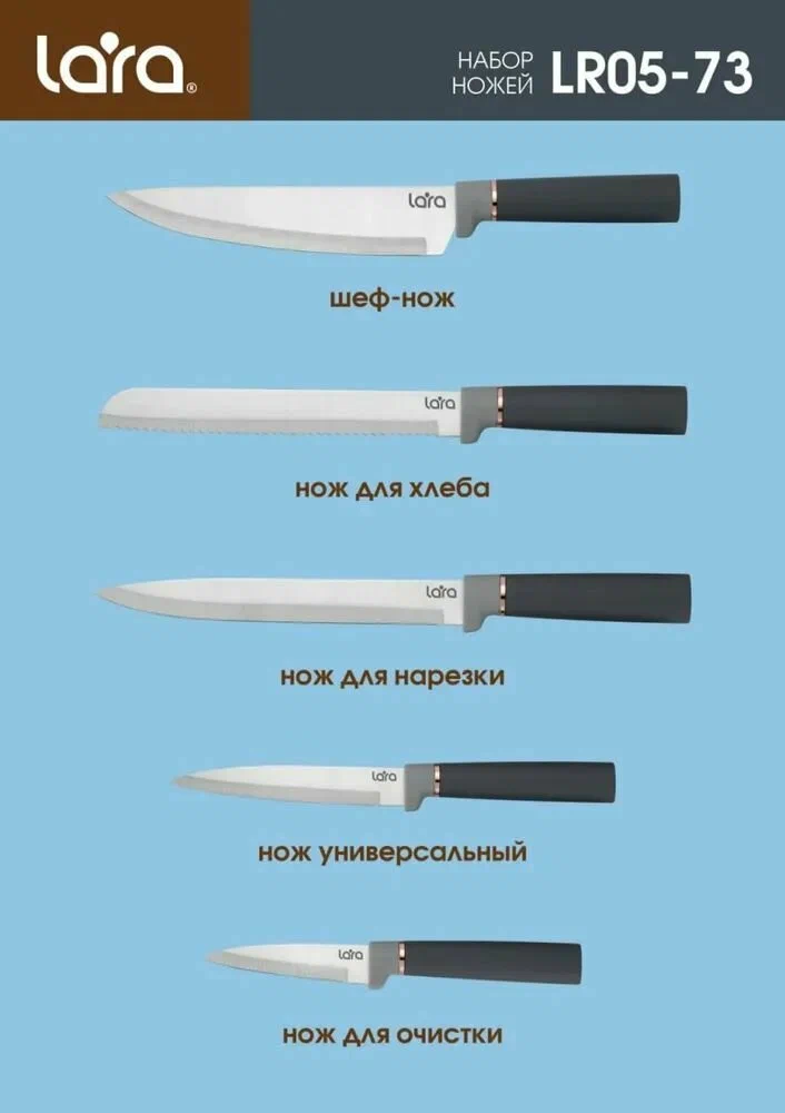 Ножи - шеф-нож, универсальный нож, нож для нарезки хлеба, нож для нарезки, нож для очистки.