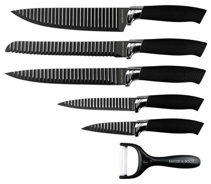 нож поварской лезвие 20,3 см, нож хлебный лезвие 20,3 см, нож разделочный лезвие 20,3 см, нож универсальный лезвие 12 см, нож для очистки лезвие 9 см, нож-пиллер