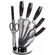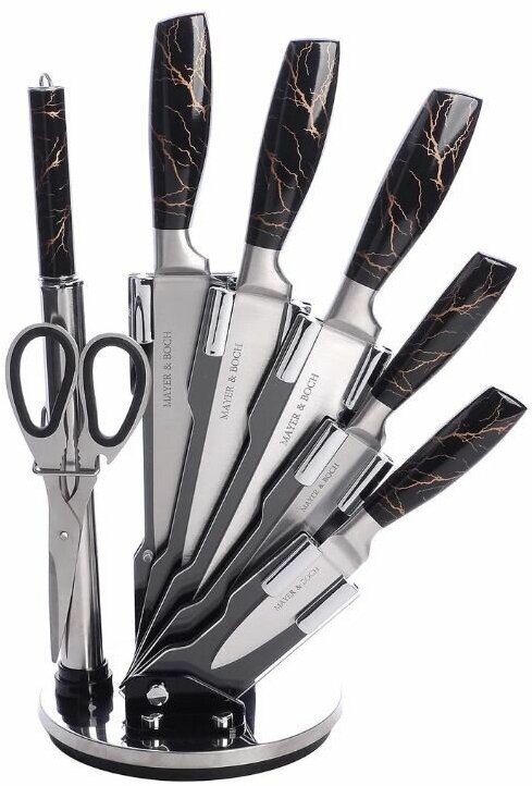 Набор включает в себя 5 ножей разного размера, мусат (ножеточку), ножницы и подставку.