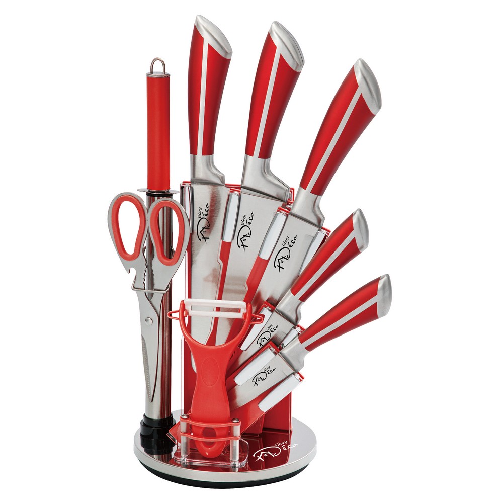 9 предметов: мусат, нож для чистки овощей 9 см., нож поварской 20 см., хлебный нож 20 см., нож для нарезки 16,5 см., нож универсальный 12,5 см., нож для чистки овощей 9 см., ножницы, овощечистка.