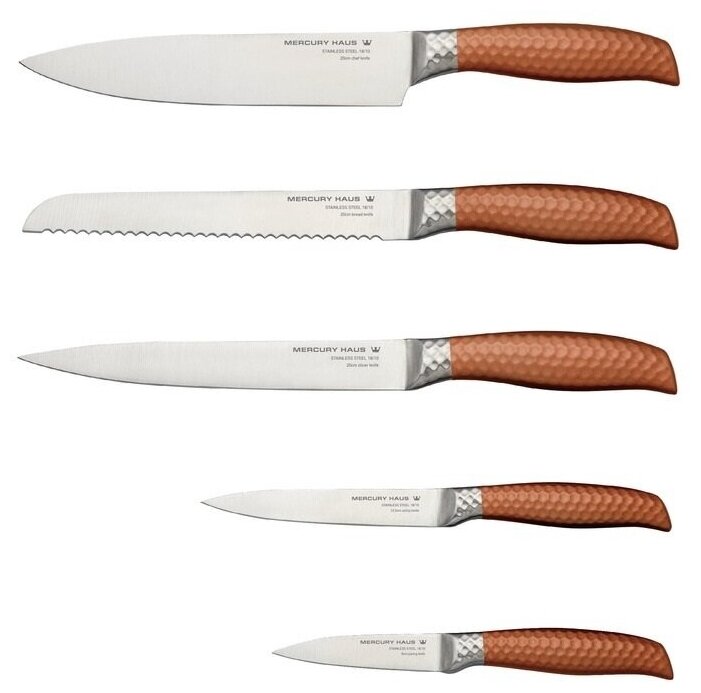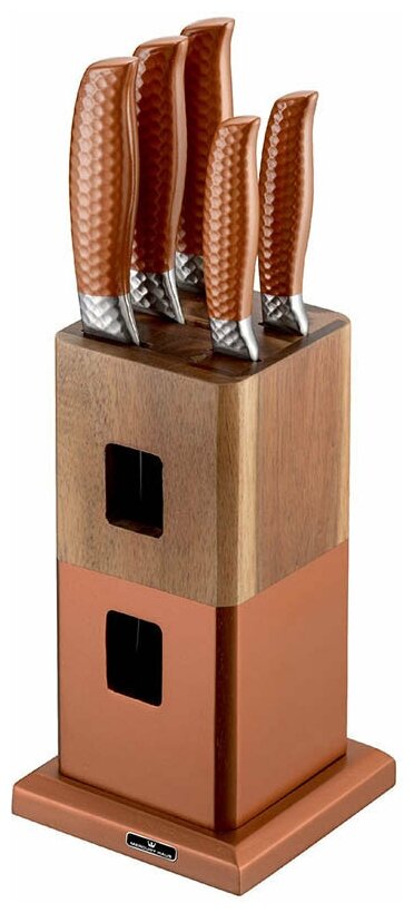 В наборе: поварской нож (20 см), нож для хлеба (20 см), нож для нарезки (20 см), универсальный нож (12.5 см), нож для чистки овощей (9 см), подставка для ножей Габариты шт (см): 38,5х16х14 Кол-во в упак.: 6