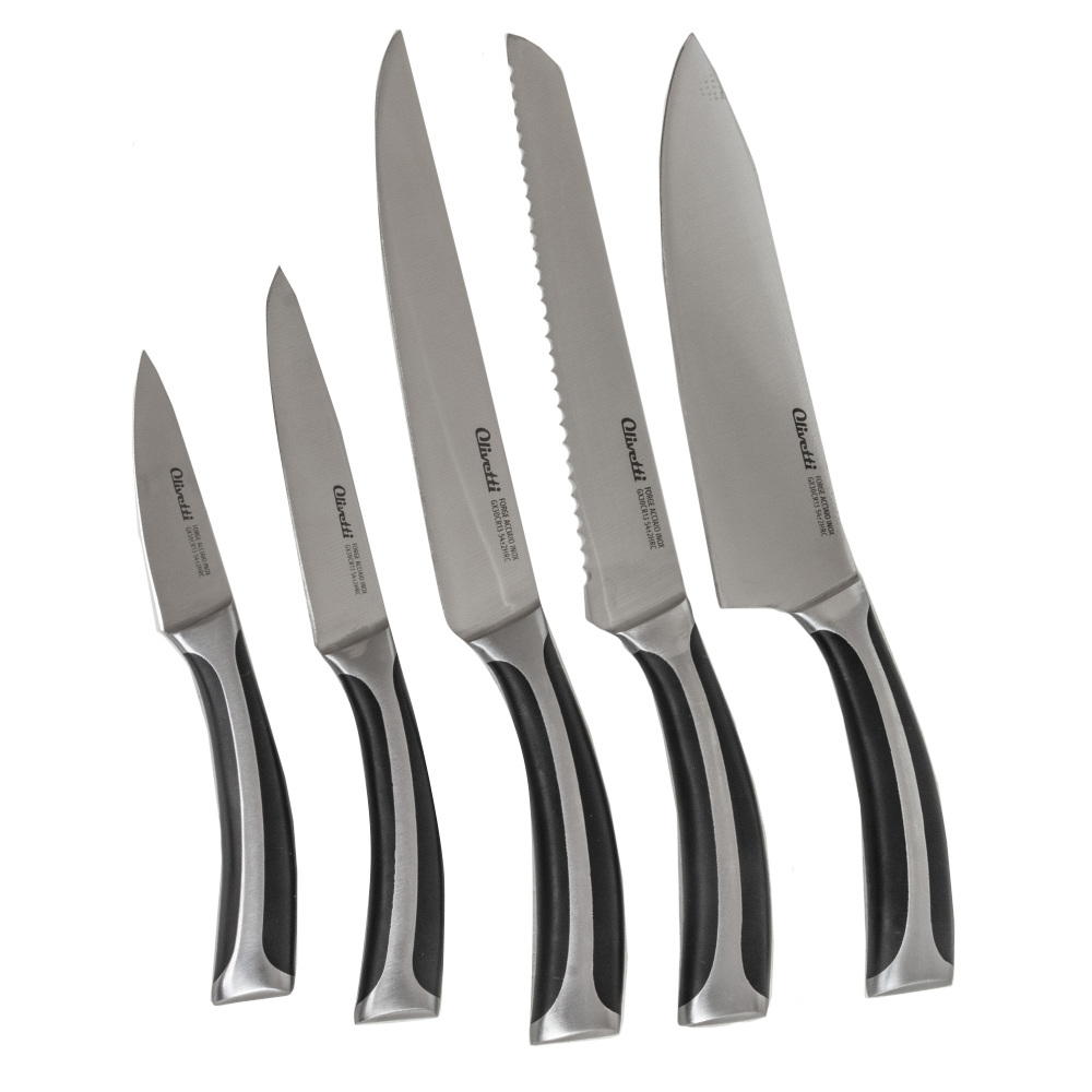 Набор кухонных ножей включает 5 популярных размера: поварской нож, нож для нарезки, нож для хлеба, универсальный нож и нож для чистки овощей.