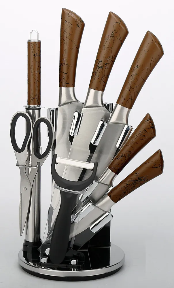 Набор кухонных ножей из нержавеющей стали 18/10 на подставке. Лезвия ножей выполнены из высококачественной нержавеющей стали, имеют гладкую и легко очищаемую поверхность, устойчивы к повреждениям и окислению. Набор ножей идеально подойдет для резки как мяса и рыбы, так и фруктов и овощей. Прочная эргономичная и нескользящая рукоятка каждого изделия удобно ложится в ладонь, обеспечивая безопасную работу, комфортное положение в руке и надежный захват. Все предметы набора компактно размещаются на вращающейся на 360 С подставке -"веере". В комплект входят разделочный нож топор, поварской нож, длинный разделочный нож, универсальный нож для нарезки, нож для нарезки овощей, ножницы, овощерезка и мусат для заточки ножей.