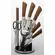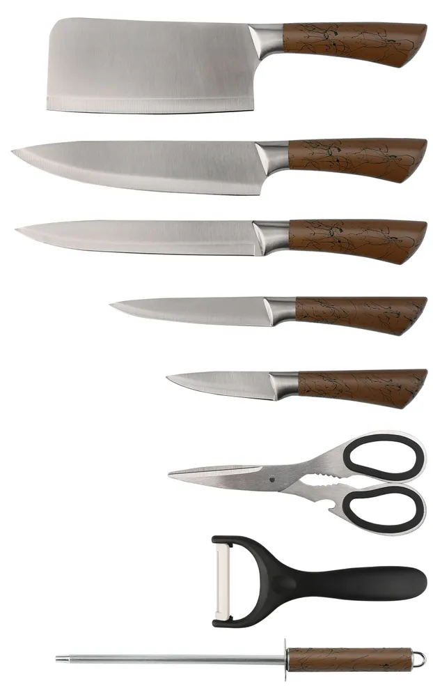 Аксессуары в наборе ножей: Кухонный топорик, Ножницы, Овощечистка, Подставка, Точилка для ножей