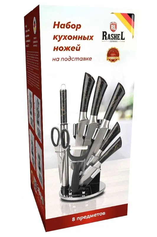 Нож-топорик идеально подойдет для разделки мяса, курицы и стейков, а также для шинковки зелени и капусты. Поварской нож отлично подойдет для нарезки мяса, рыбы, теста и хлеба, а также для измельчения любых продуктов во время готовки. Длинный разделочный нож подходит для разделки мяса и рыбы. Главным образом нужен, чтобы отделять мясо от кости и тонко нарезать филе.Многофункциональный универсальный нож нарежет сыр, колбасу, ветчину, суши и пиццу, картошку. Маленький овощной нож специально разработан для очистки овощей и фруктов, картофеля, и фигурной и мелкой резки. Ножницы совмещены с открывашкой для банок и бутылок и орехоколом. Овощечитка для овощей и фруктов подходит для снятия кожицы с любых фруктов и овощей. Точилка для ножей мусат для выравнивания режущей кромки ножа и возвращения остроты ножу, т.е. для поддержания его в рабочем состоянии. Набор кухонных ножей и аксессуаров Rashel включает в себя всё самое необходимое для ежедневного приготовления пищи, а его стильный современный дизайн украсит интерьер вашей кухни. Набор ТМ Rashel подходит для мытья в посудомоечной машине.