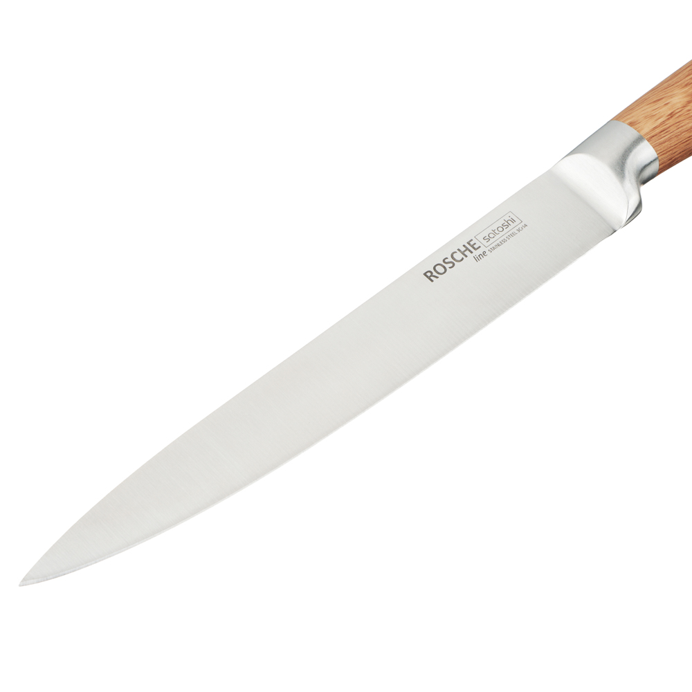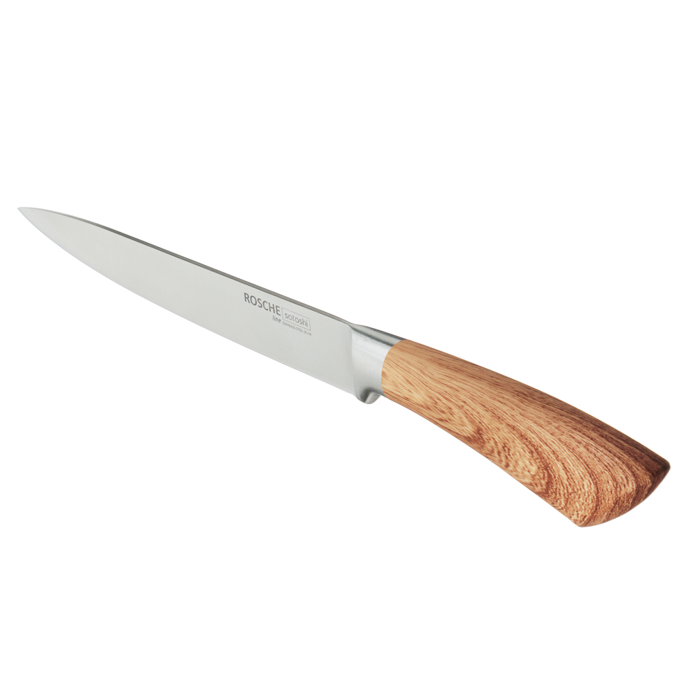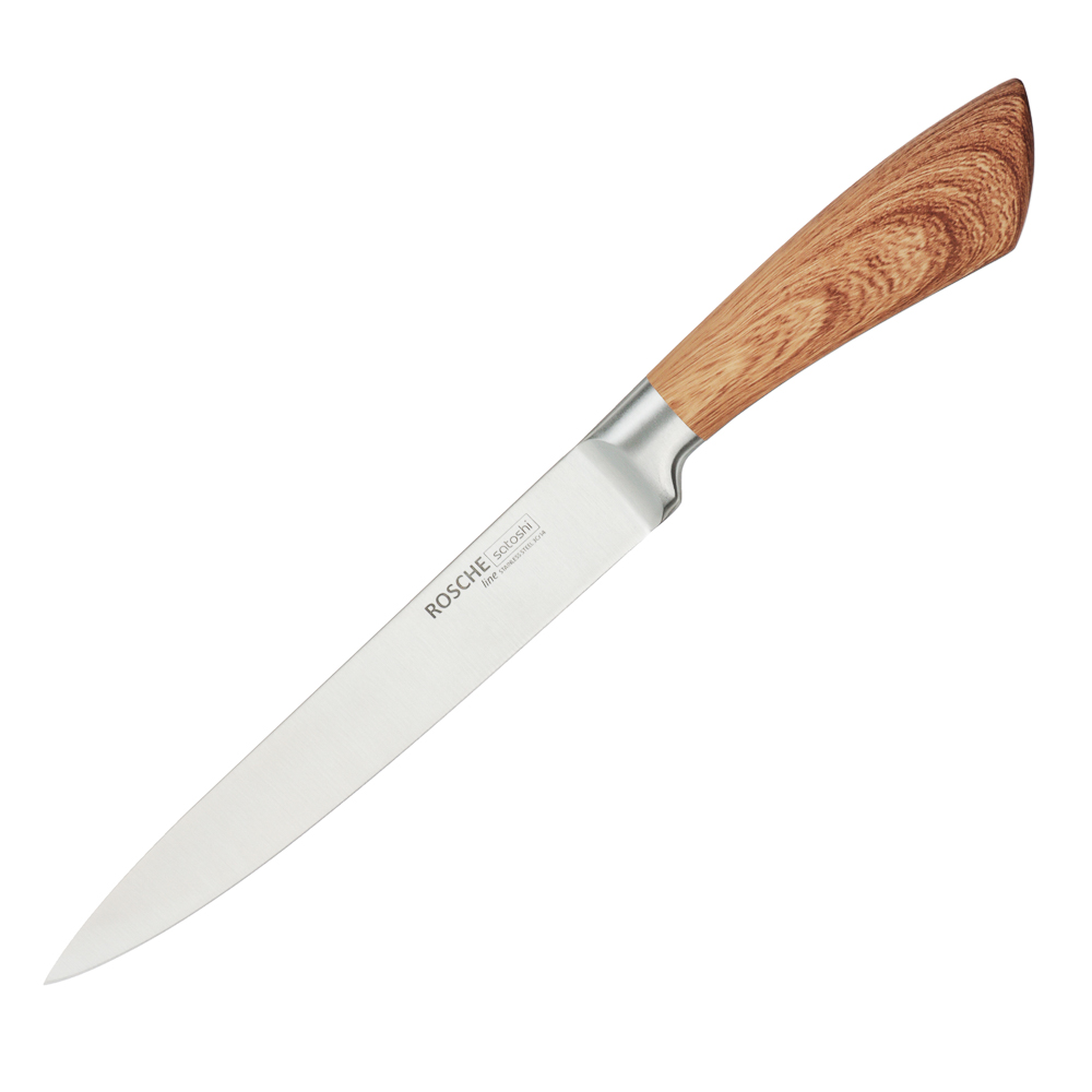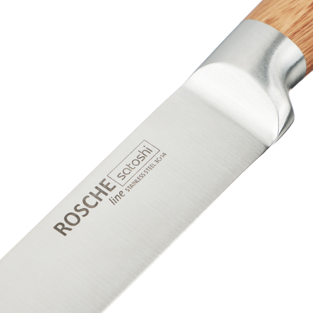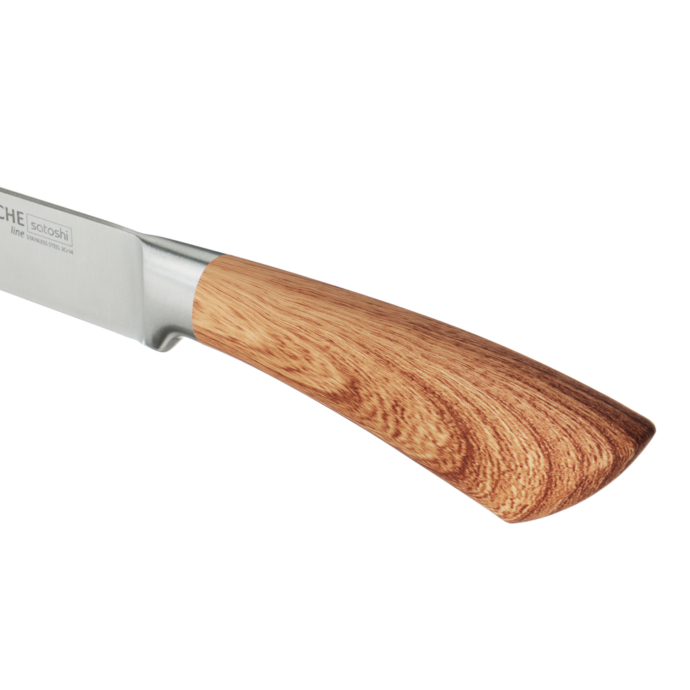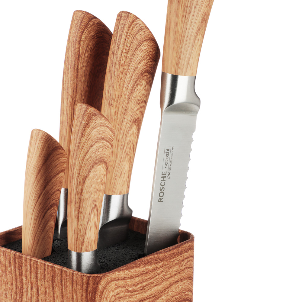 Набор кухонных ножей SATOSHI «Роше» из 6 предметов на устойчивой подставке с полипропиленовыми разделителями включает 5 ножей, выполненных в едином стиле. Набор подходит для всех вариантов нарезки и разделки продуктов и включает шефский нож, универсальный, хлебный, овощной нож, а также маленький нож для чистки овощей и фруктов. Острые лезвия из нержавеющей стали с антиналипающим и антибактериальным покрытием не подвержены коррозии, долго держат заточку, поэтому ножи будут служить много лет. Стильный дизайн станет выигрышным дополнением интерьера современной кухни.