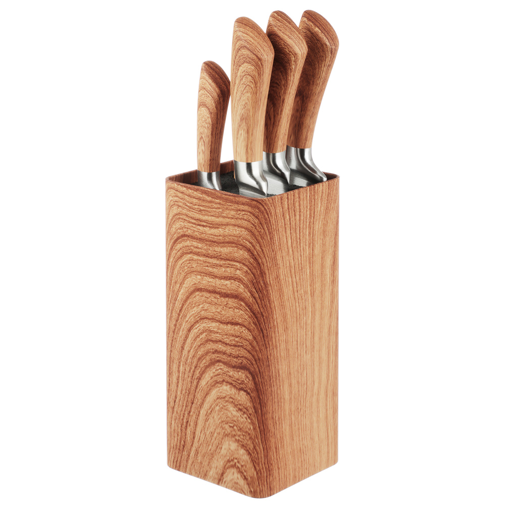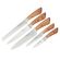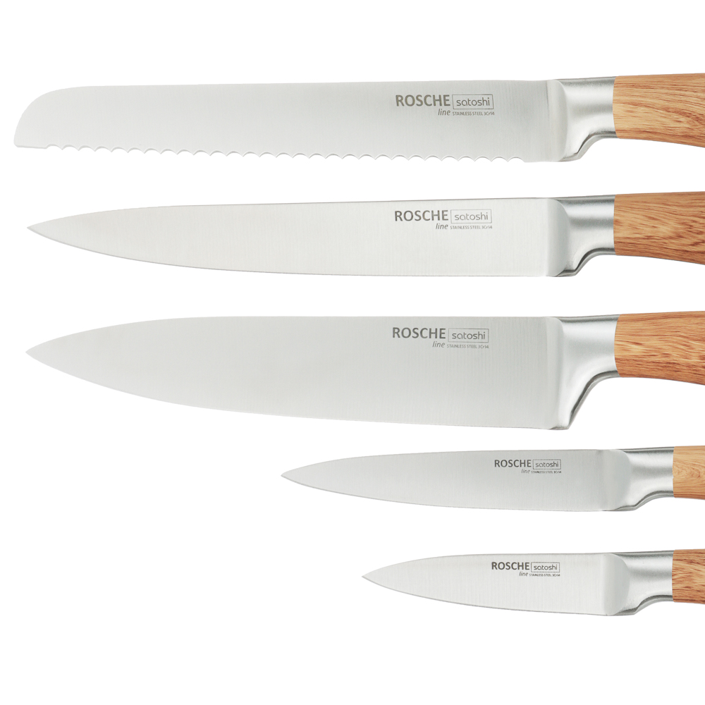 Состав набора: 20 см шеф нож, 20 см нож для нарезки, 20 см нож для хлеба, 12,7 см универсальный нож, 9 см нож для чистки овощей и фруктов. Толщина лезвия ножей 2,5 мм.
