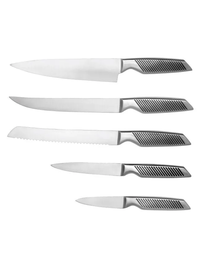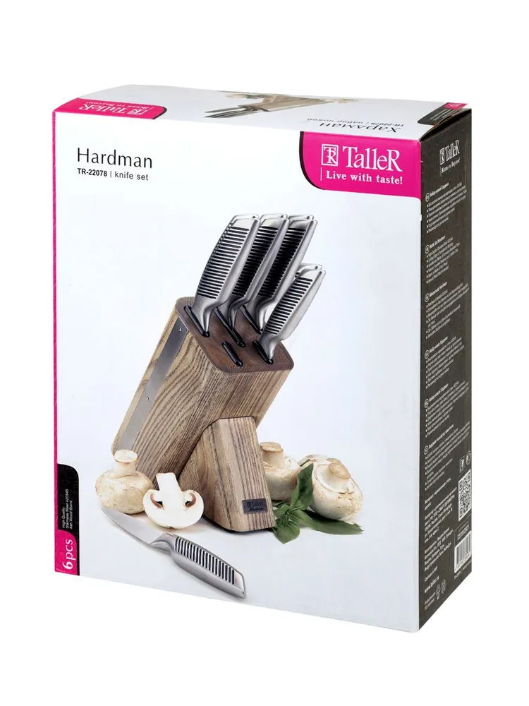 Ножи помогут вам справиться с различными задачами на кухне. В набор входят хлебный, овощной, поварской, разделочный и универсальный ножи. Кроме того, вы получите удобную деревянную подставку для их хранения.