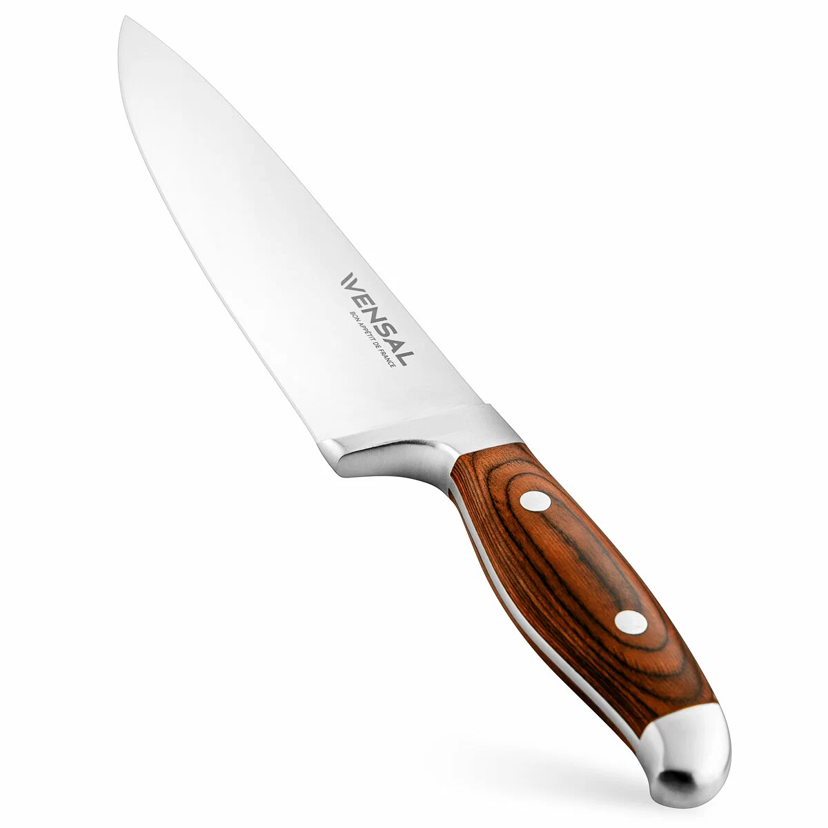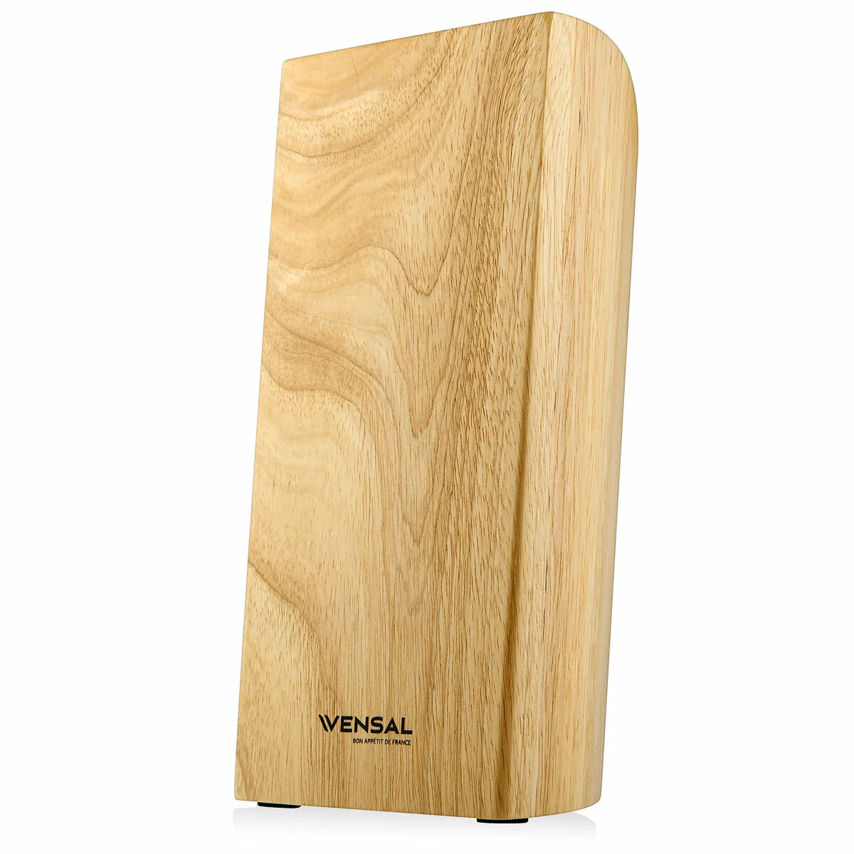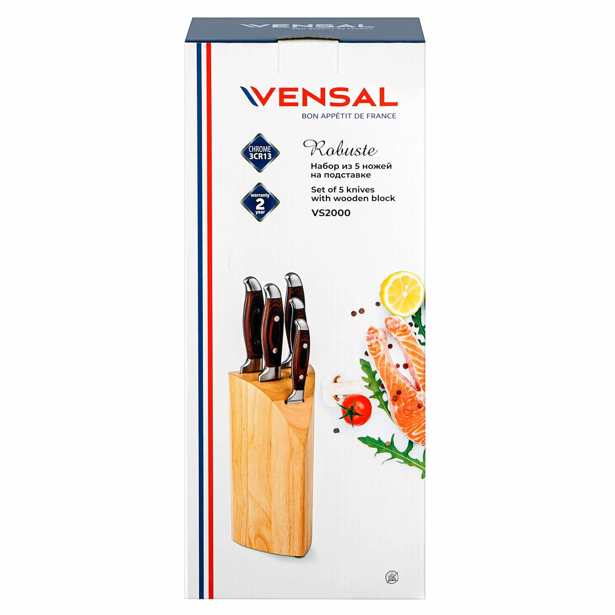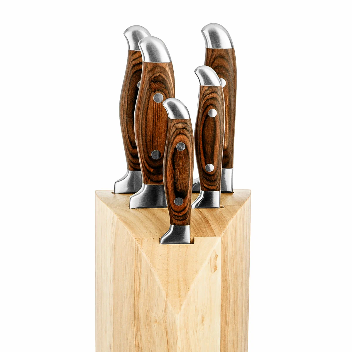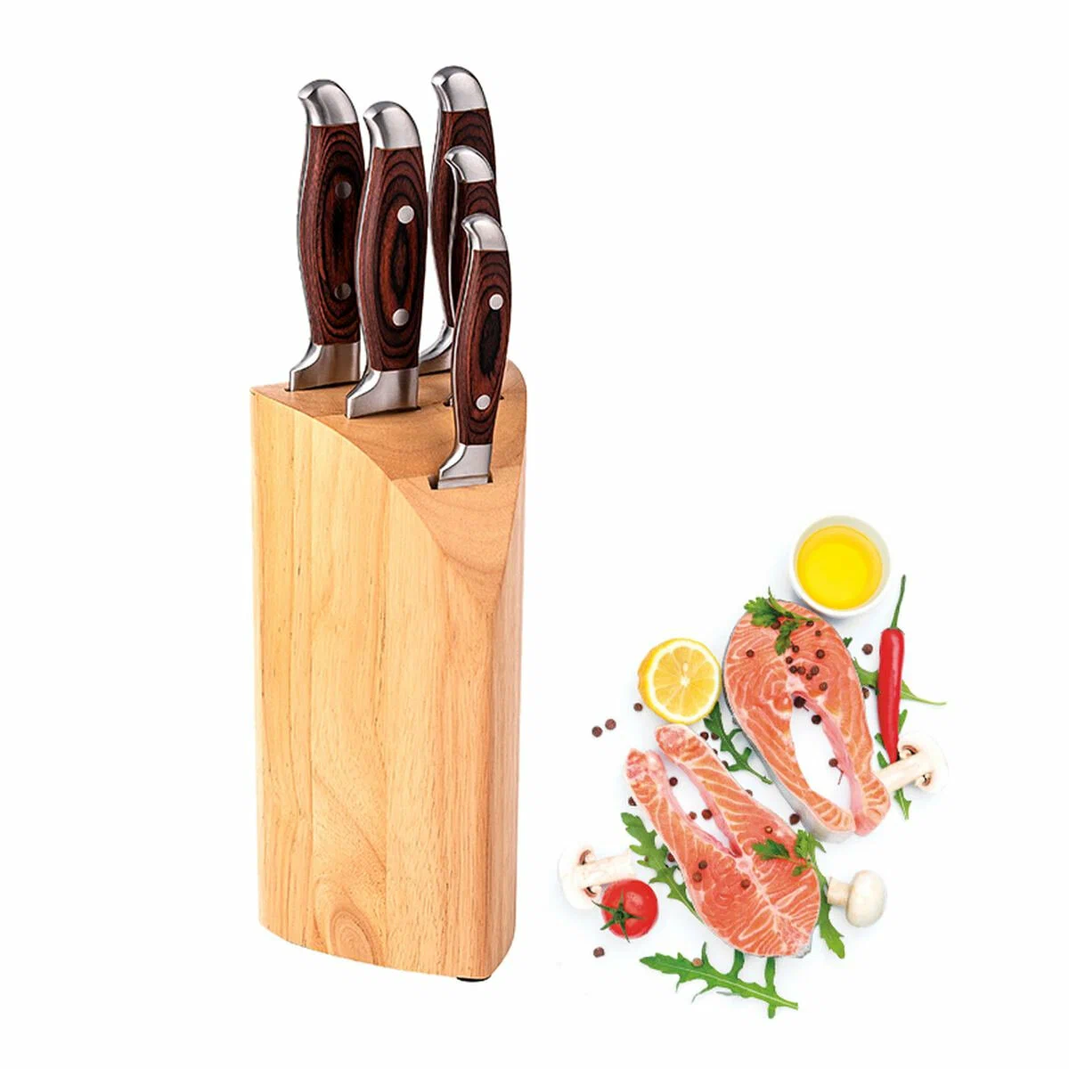 Поварской нож 20 см, толщина лезвия 2,5 мм; Хлебный нож 20 см, толщина лезвия 2,5 мм; Разделочный нож 20 см, толщина лезвия 2,5 мм; Универсальный нож 12,7 см, толщина лезвия 2,0 мм; Нож для овощей 8,9 см, толщина лезвия 2,0 мм; Материал клинка легированная нержавеющая сталь 3Cr13. Твердость по шкале Роквелла 52-54 HRC. Материал рукоятки нержавеющая сталь и прессованная древесина. Двухклепочное крепление рукоятки. Пятка европейского типа. Подставка изготовлена из каучукового дерева. Подставка с нескользящими ножками. Нельзя мыть в посудомоечной машине