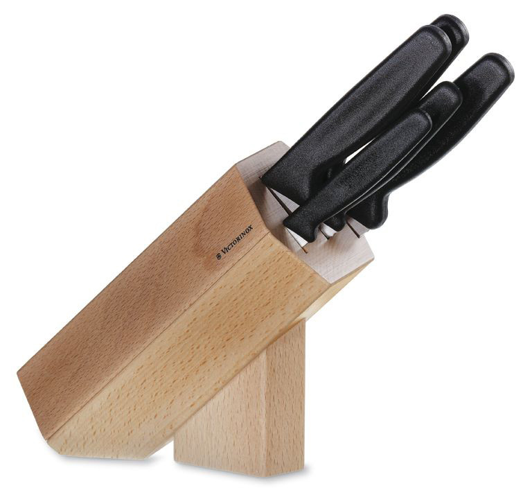 Описание: В наборе пять ножей: нож для чистки овощей, 6 см; нож для томатов и сосисок, серрейтор, 11 см; разделочный нож, 12 см; разделочный нож, 18 см; нож для хлеба, серрейтор, 18 см. В комплект входит специальная подставка из светлого дерева для хранения.