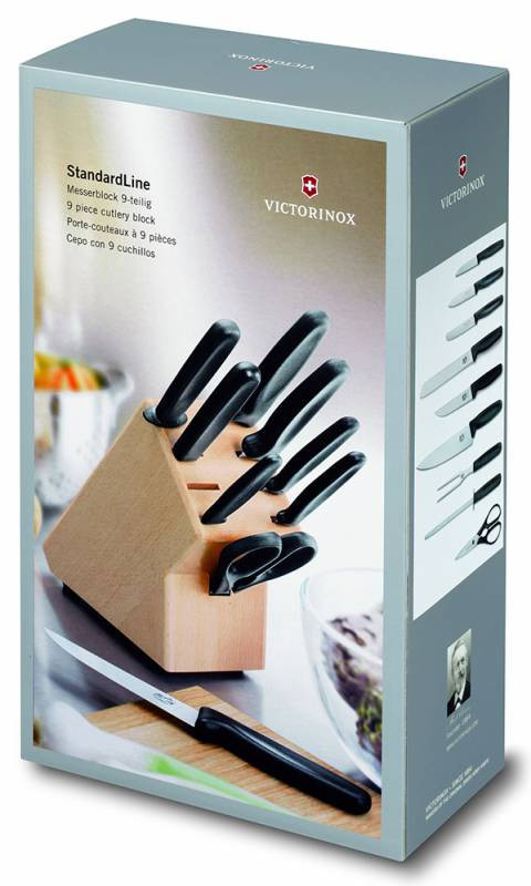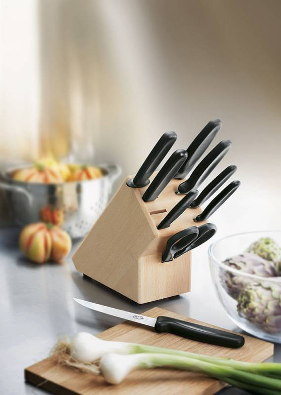 Описание: В наборе удобная подставка из бука и предметы различного назначения: нож для овощей, 8 см; нож для овощей, 10 см; нож для томатов, 11 см; нож для хлеба, 21 см; нож для нарезки, 15 см; нож поварской, 22 см; вилка разделочная, 15 см; кухонные ножницы, 20 см; мусат, 20 см.