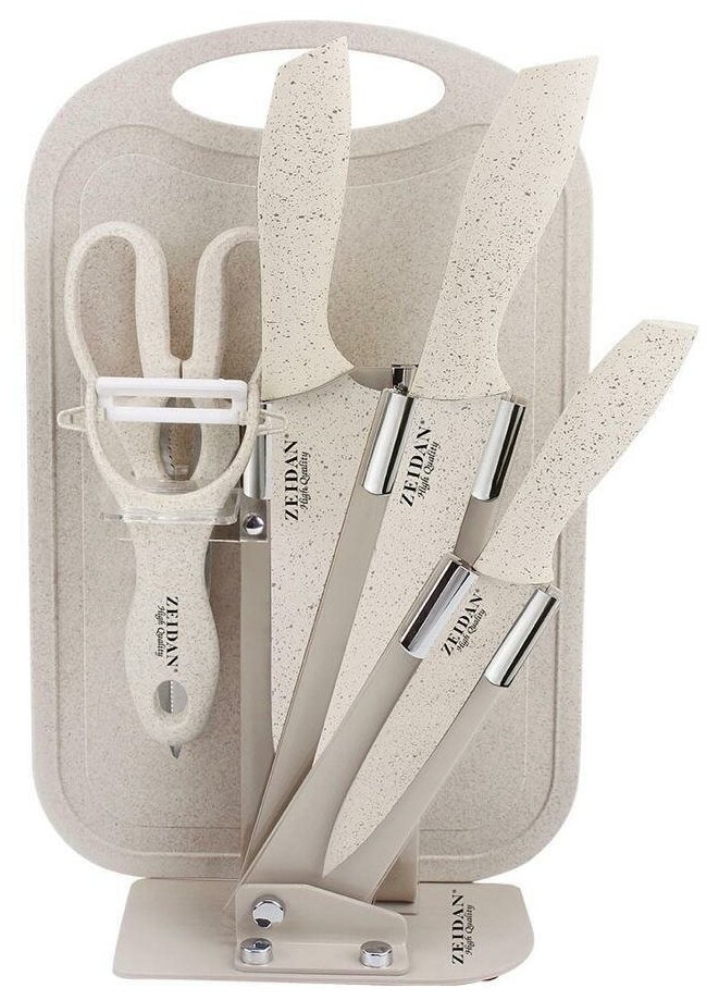 (нож поварской -1,5mm/7,5, нож разделочный -1,5mm/8, нож универсальный - 1,2mm/5, ножницы, овощечистка с керамическим лезвием, доска разделочная