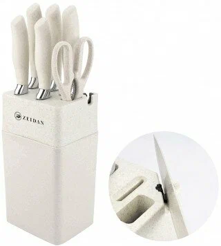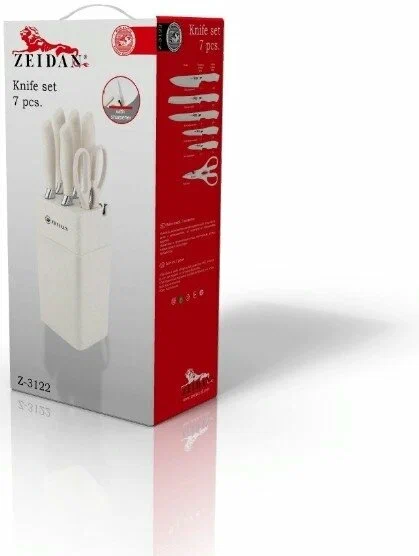 Поварской нож; Нож для хлеба; Нож разделочный; Нож универсальный; Нож для овощей; ножницы; Подставка; Подарочная упаковка.
