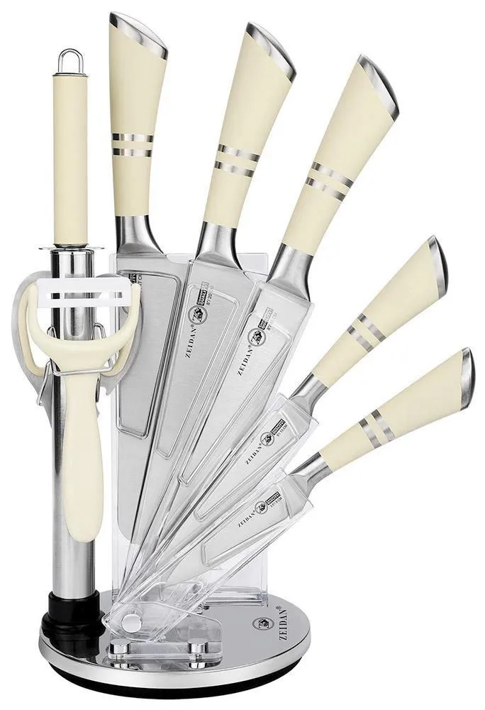 Набор ножей, 9 предметов, поварской нож, нож разделочный, нож -топорик, универсальный нож, нож для овощей, мусат, ножницы, овощечистка с керамическим лезвием ручки - нержавеющая сталь с декором, складная подставка из акрила, подарочная упаковка.