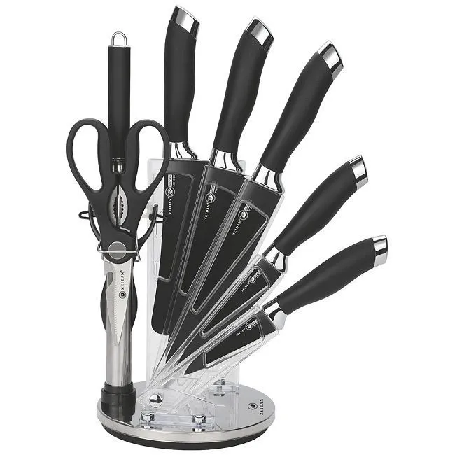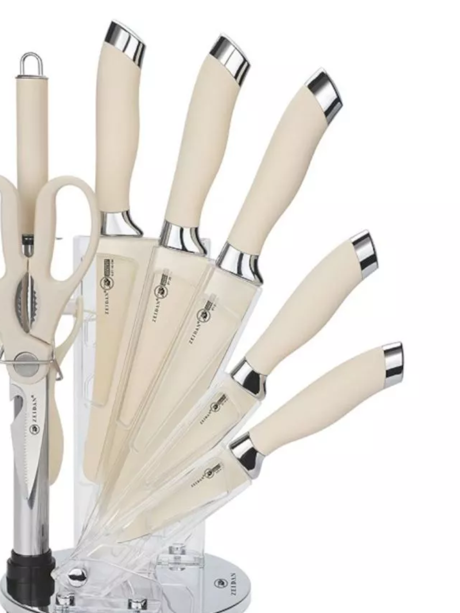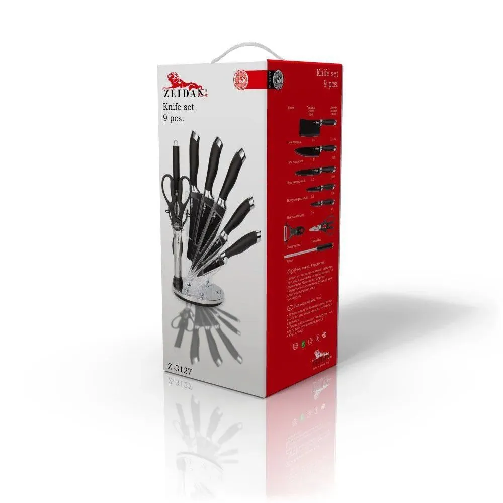 Аксессуары в наборе ножей: Подставка, Овощечистка, Ножницы, Подарочная упаковка, Точилка для ножей