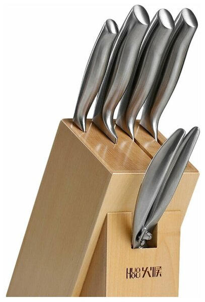 Набор ножей HuoHou Nano Knife из немецкой стали HU0014 включает острые, гибкие, прочные и удобные в использовании ножи и ножницы: нож для овощей, шеф-нож, универсальный нож, нож-топорик и ножницы (1 шт.). Так же, в набор входит специальная деревянная подставка.