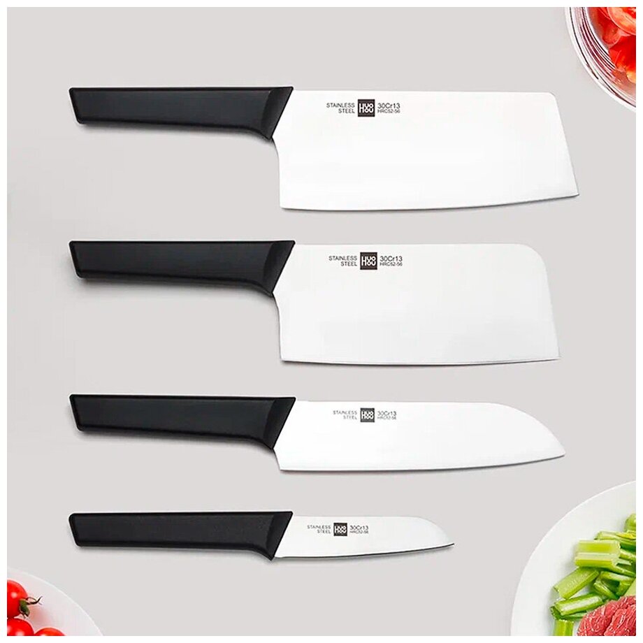 Набор кухонных ножей с подставкой HuoHou HU0058 Black RUS – это 4 готовых к использованию заточенных ножа и удобные ножницы с дополнительными функциями. Все эти элементы не боятся ржавчины и повреждений. Кухонные ножи HuoHou позволят вам готовить еду с комфортом и экономить время. Самое основное преимущество, которым обладает набор кухонных ножей HuoHou 6 HU0058 Black RUS – высокоуглеродистая сталь и нетоксичный пластик, из которых сделаны все его элементы. Набор ножей с подставкой можно мыть водой как вручную, так и в посудомоечной машине, они готовы к постоянной работе и не боятся царапин, что позволяет сохранить внешний вид при хранении с другими приборами. Каждый нож из набора — это инструмент повара, который подойдет для быстрого измельчения и нарезки любых продуктов, а топорик справится также и с костями. Набор столовых ножей HU0058 имеет в своём арсенале элементы для решения большинства повседневных задач. HU0058 состоит из таких предметов, как кухонный слайсер для мяса, хлеба и прочих продуктов, нож-сантоку, маленький нож для чистки овощей и фруктов, нож для рубки мяса Ножницы универсальные стальные также входят в комплект для более мелкой работы. Все ножи кухонные из нержавеющей стали в составе HU0058 универсальны, кроме этого, набор сэкономит вам средства на покупку кухонных аксессуаров. Например, входящие в набор ножницы универсальные не только для нарезки, но также могут открывать бутылки и колоть орехи. Приятный дизайн и подставка из экологичного материала – вот то, что делает данный набор «своим» на любой кухне. Нож с черной ручкой – это классика, которая подойдет к любому интерьеру, а высококристаллический пропилен, использованный в рукоятках, делает ножи и ножницы удобными и нетоксичными. Комплект ножей с подставкой HU0058 не требует особых условий для хранения, все предметы из его состава могут быть всегда у вас под рукой, благодаря тому, что собраны в одном месте. Подставка с ножами всегда также неприхотлива, так как прошла специальную обработку, предотвращающую появление плесени и растрескиваний. Обратите ваше внимание при поиске ножей, что, поварской комплект HuoHou из нашего магазина является оригинальным товаром, прошедшим сертификацию. Русская версия товара подразумевает отсутствие иероглифов и наличие понятного описания. Подарочный набор ножей для любителя осваивать рецепты станет хорошим выбором среди прочих.