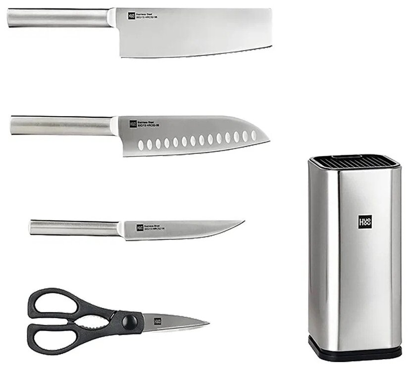 Универсальный набор острых ножей для самых различных задач. С их помощью можно быстро и красиво нарезать мясо, рыбу, овощи и любой другой продукт. В комплект входят также ножницы – универсальный и незаменимый на кухне инструмент