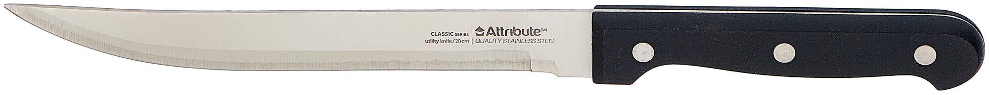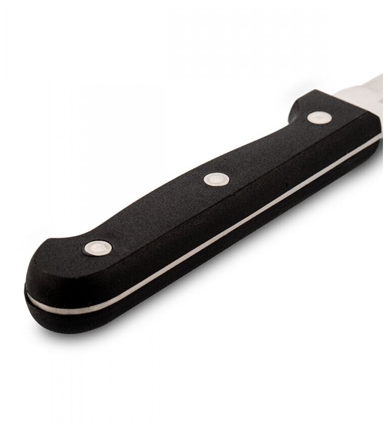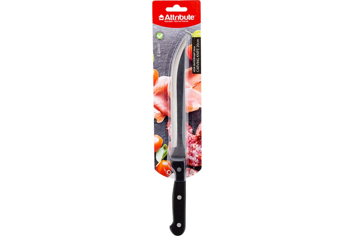 Нож кухонный выполнен из нержавеющей стали. Длина лезвия - 20 см, толщина лезвия - 2 мм. Кухонный нож рекомендован к использованию в бытовых условиях. Не рекомендуется использовать в посудомоечной машине .