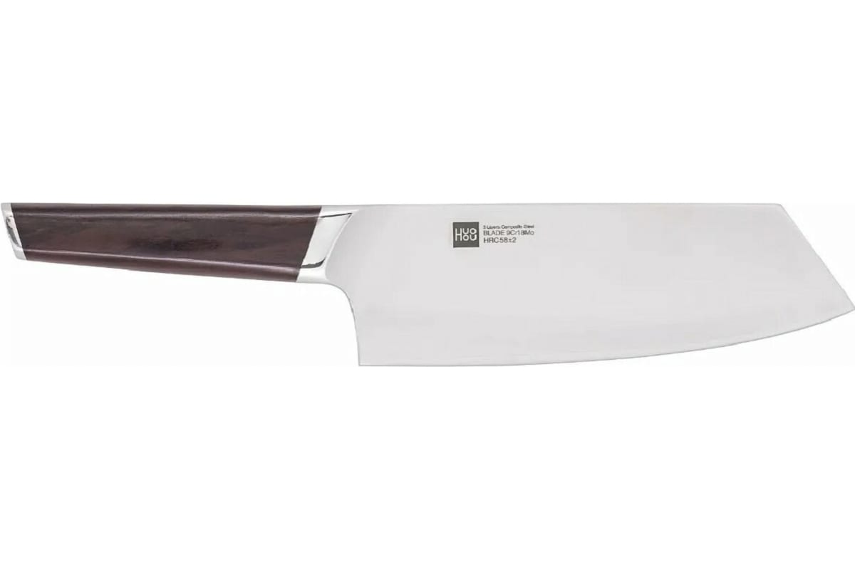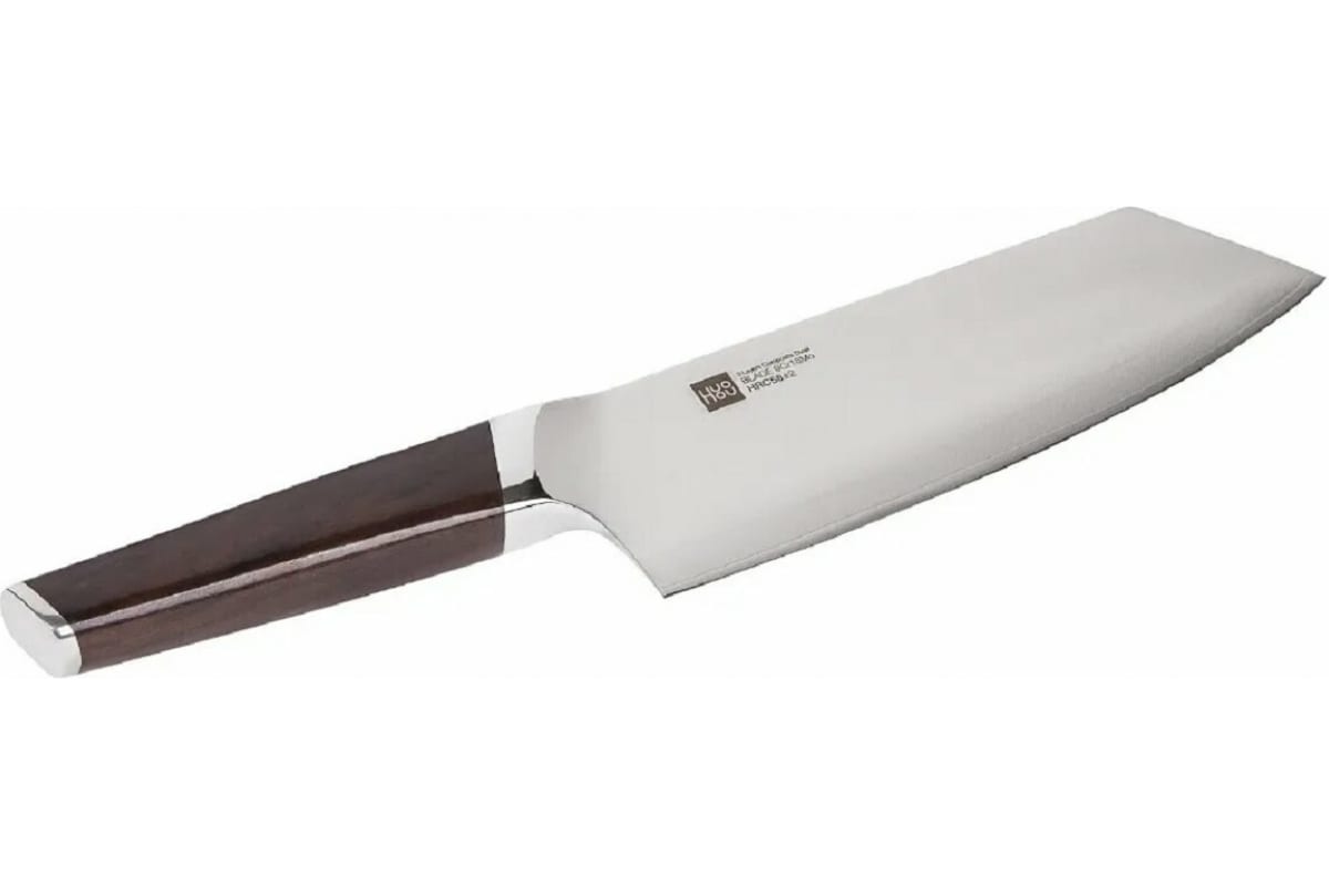 Нож сделан из высоколегированной стали, которая устойчива к появлению коррозии и различных внешних повреждений. Ручка выполнена из черного дерева. Размер лезвия составляет 19,7 см, вес изделия 0,4 кг. Кухонный нож-топорик подойдет для разделывания мяса и рыбы.